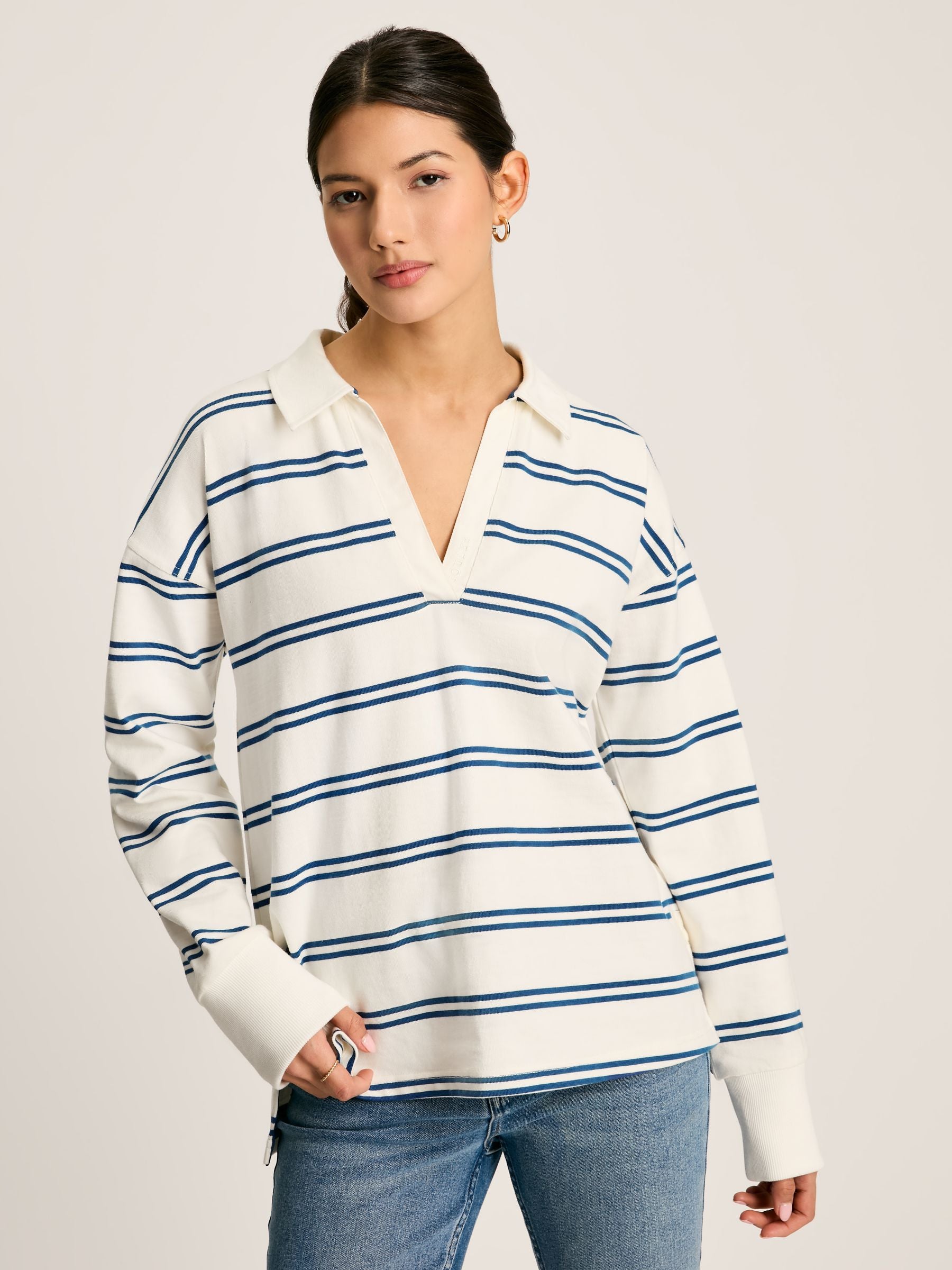 Made from soft cotton jersey with a relaxed fit, this elevated take on the deck shirt features a twill open collar and dropped hem for a laid-back feel. The timeless horizontal stripes pay homage to its coastal origins.