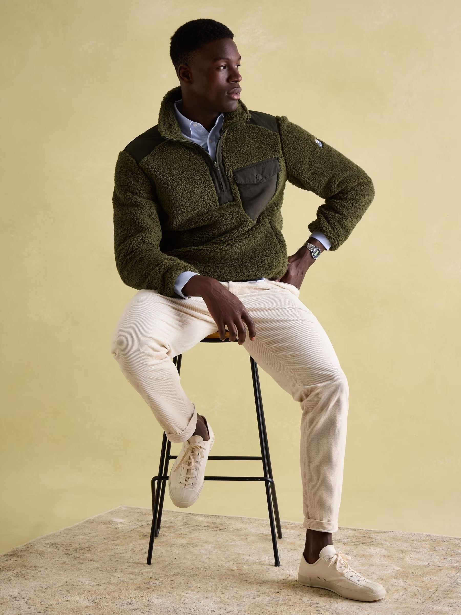 Made with borg fleece, this sweatshirt guarantees warmth and comfort. The contrasting woven fabric adds a modern touch, while the funnel neck and quarter zip provide extra coverage. Premium embroidery details complete the elevated look.