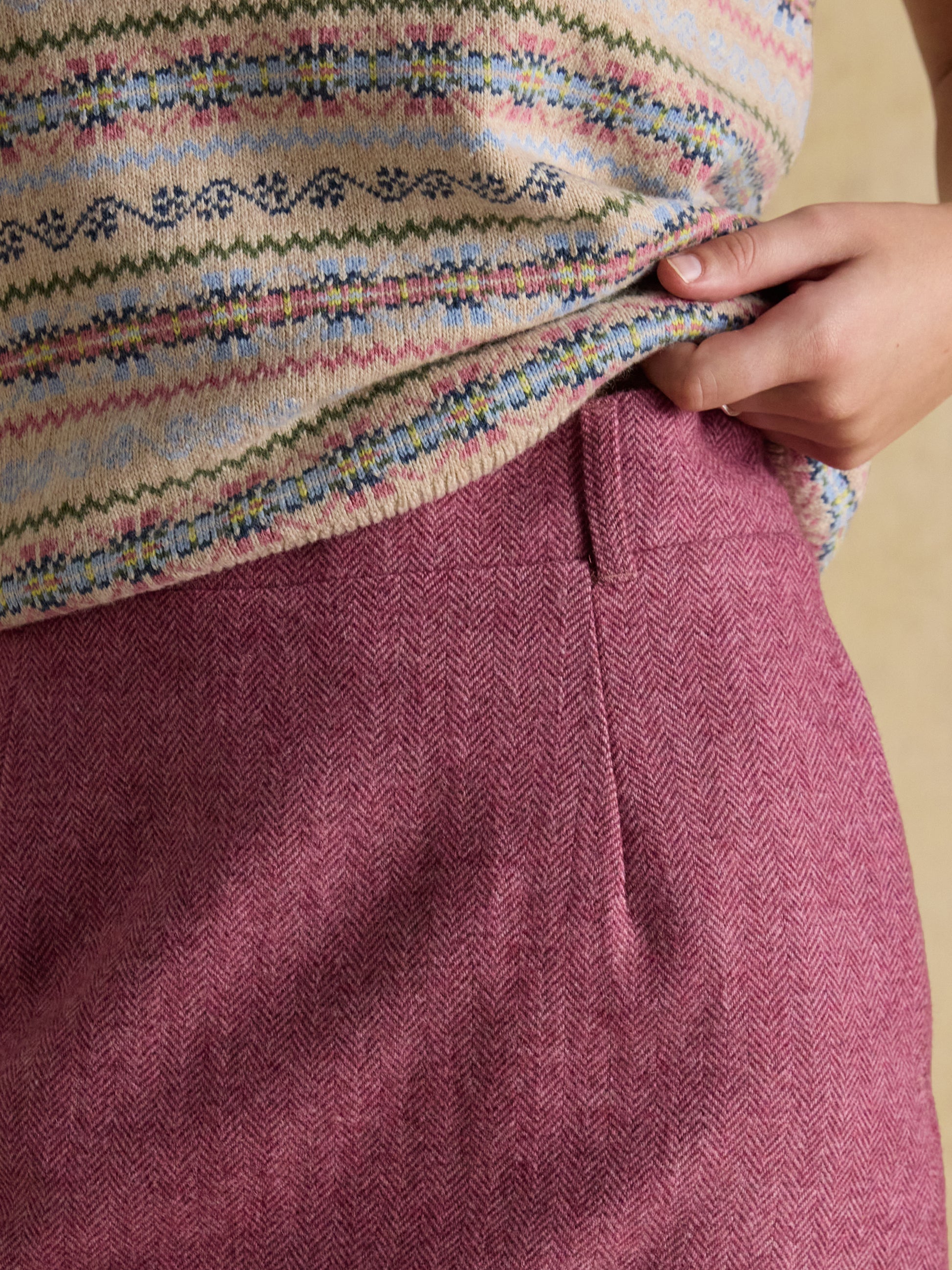 Crafted from classic tweed, it offers enduring style that enhances any wardrobe. Its side pockets provide convenient storage, while a discreet zip ensures a clean finish. This versatile skirt is an essential piece for refined, effortless dressing.