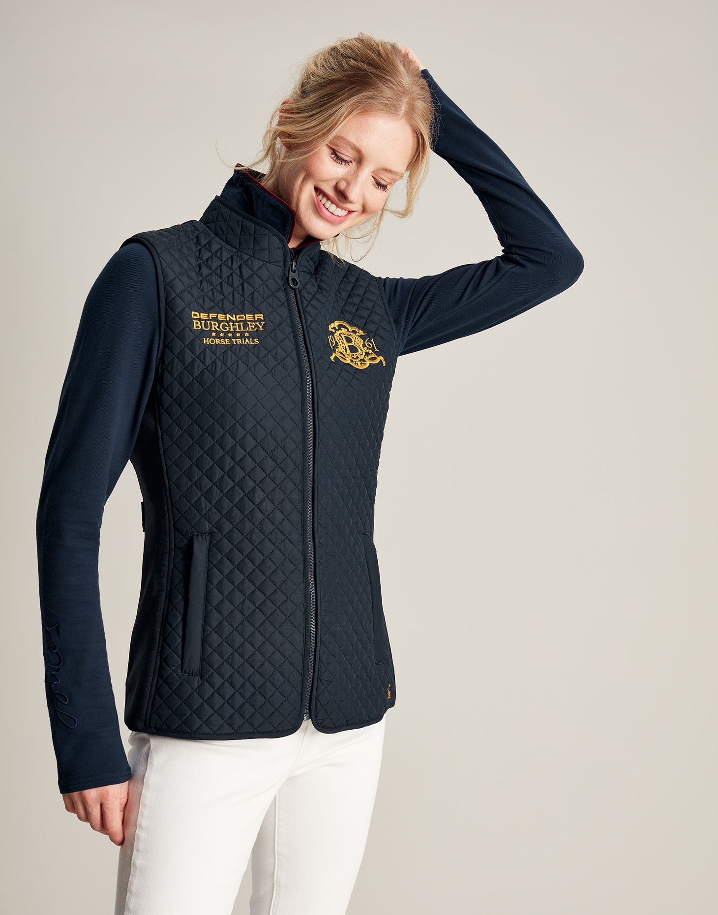 It features diamond quilting for a classic equestrian look, a zip fastening, two side pockets, a curved hem, and a back channel with poppers for a comfortable fit. Its ribbed side panels offer a fitted shape, and the official event embroidery on the chest stands as a mark of quality. Ideal for the Burghley Horse Trials and beyond!