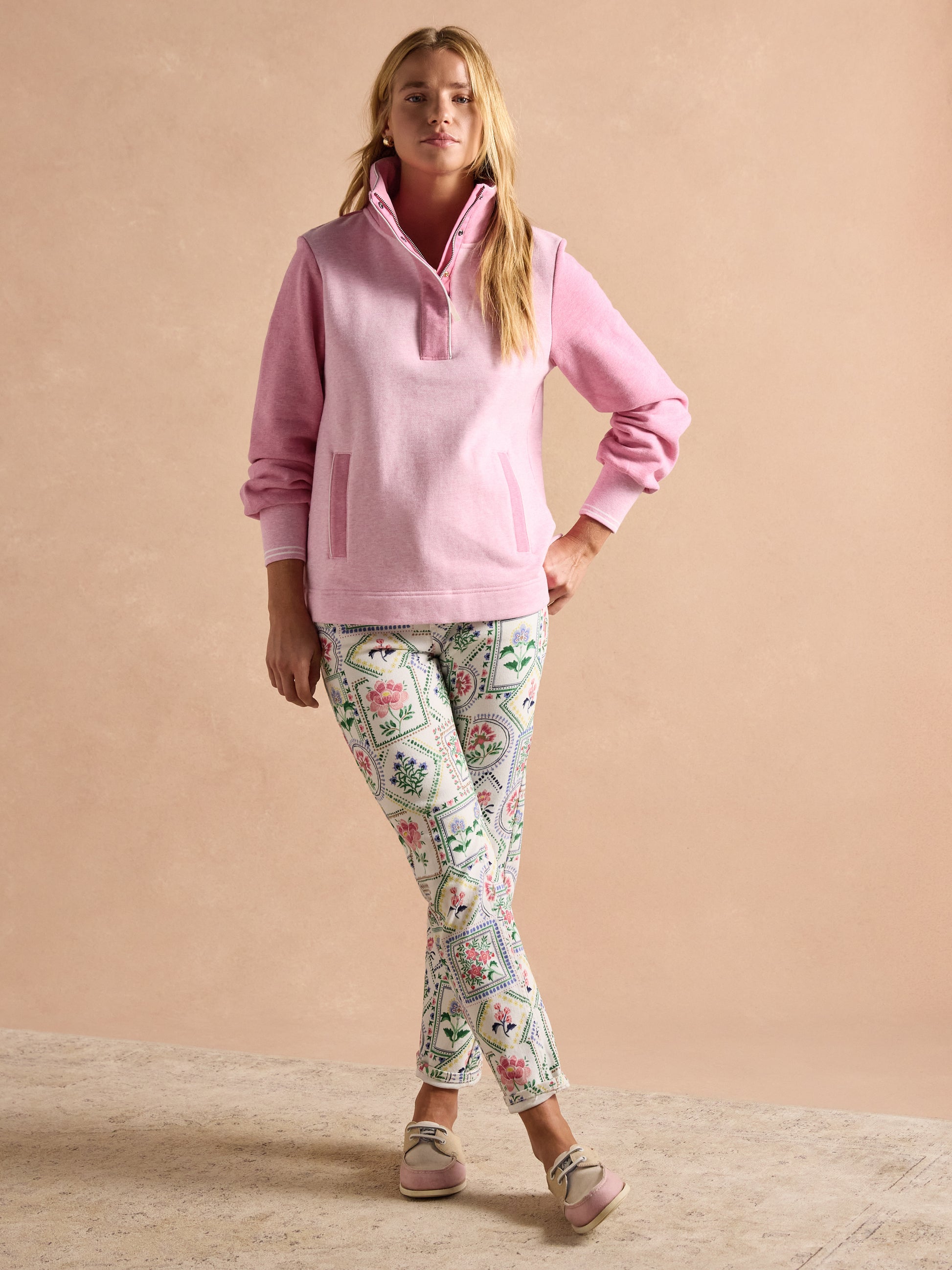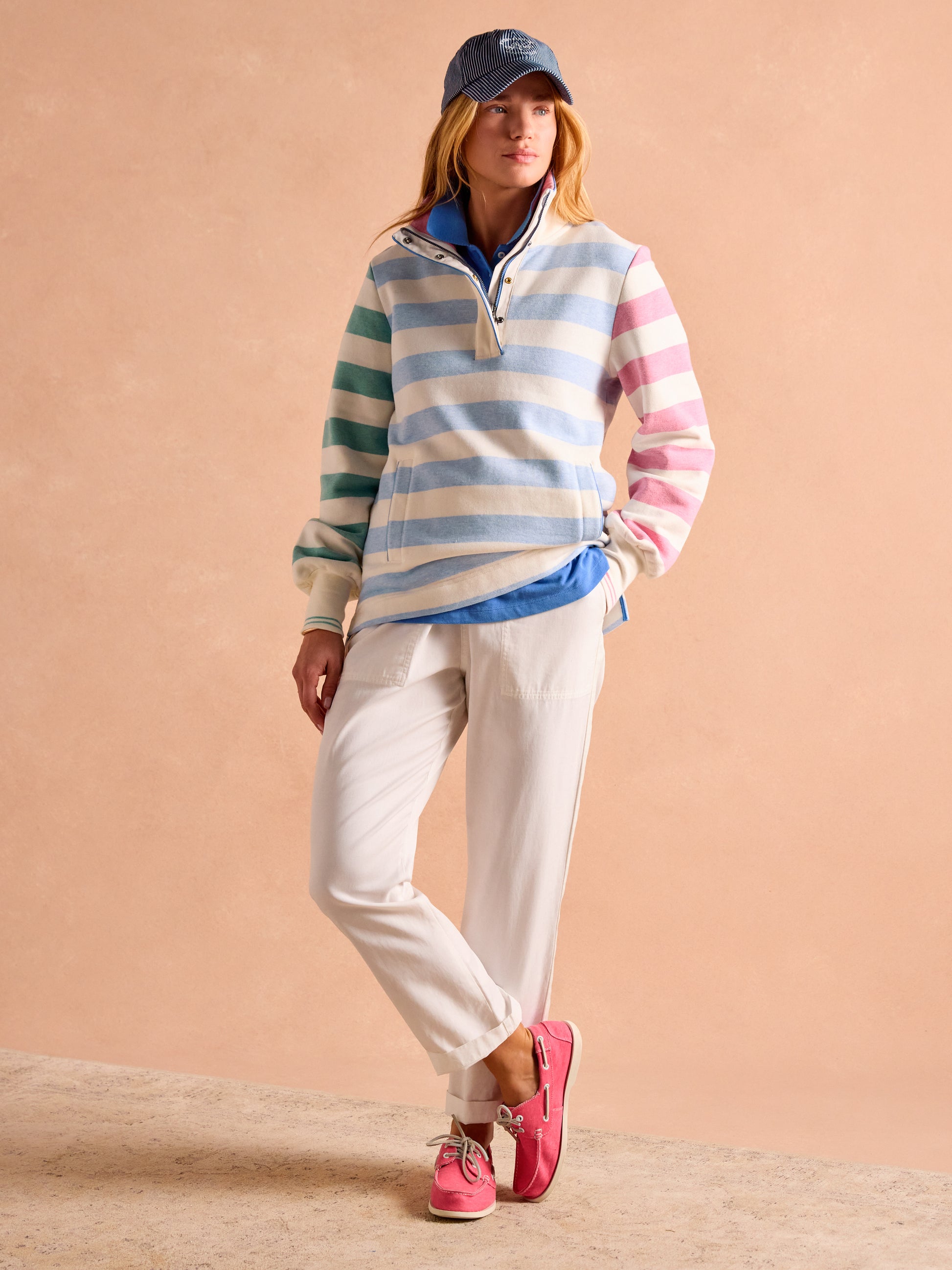 Made with heavyweight jersey fabric, twill zip guard, and deep ribbed hems and cuffs, this relaxed fit sweatshirt offers both comfort and durability. With stand-out details like piped trims, woven collar facing, and branded embroidery, it's a versatile addition to your wardrobe. The concealed quarter zip and popper placket make layering a breeze, while the dropped hem, deep side vents, and front welt pockets add to the laid-back look. Choose from regatta stripes or floral prints and elevate your style game.