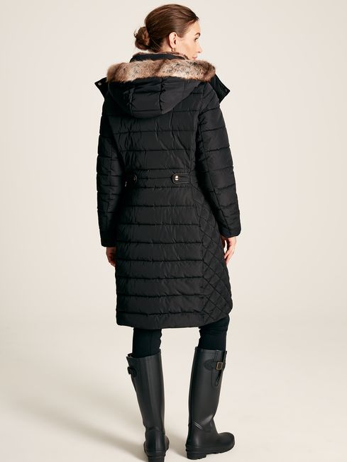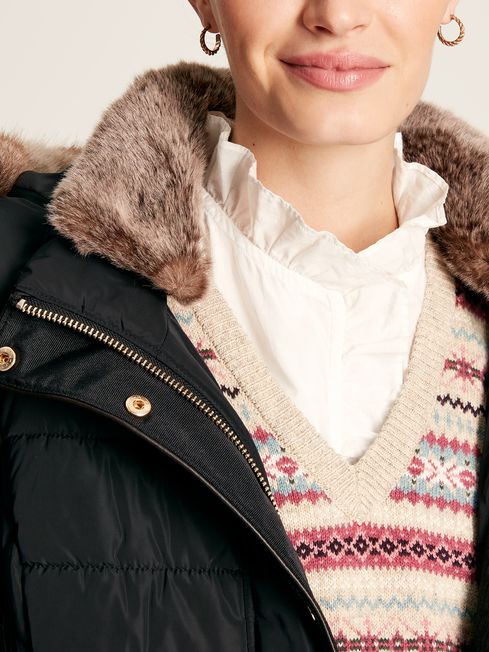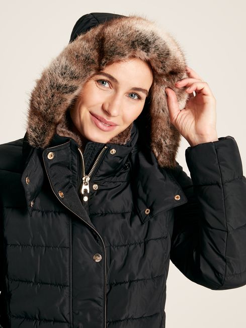 It features a detachable hood with faux fur trim and storm cuffs for extra coverage. Crafted with slimmer baffles and diamond quilted side panels, this coat offers a snug, flattering fit. Finished with bespoke jacquard print and faux leather piping, this unique padded coat is sure to keep you cozy and comfortable.