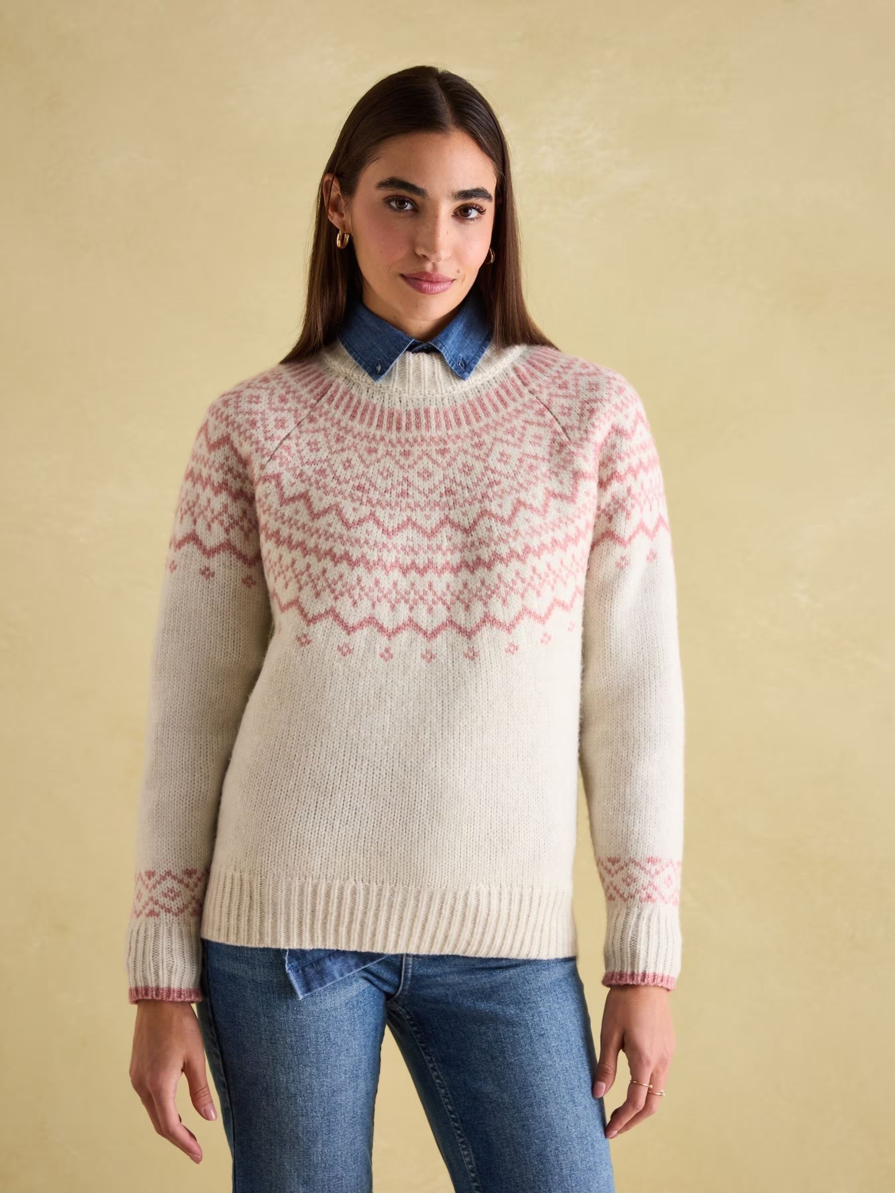 Made from a soft wool blend, this classic cream jumper features a traditional Fair Isle pattern on the yoke and cuffs. Its raglan sleeves and ribbed crew neck, hem and cuffs make it both stylish and practical for layering.