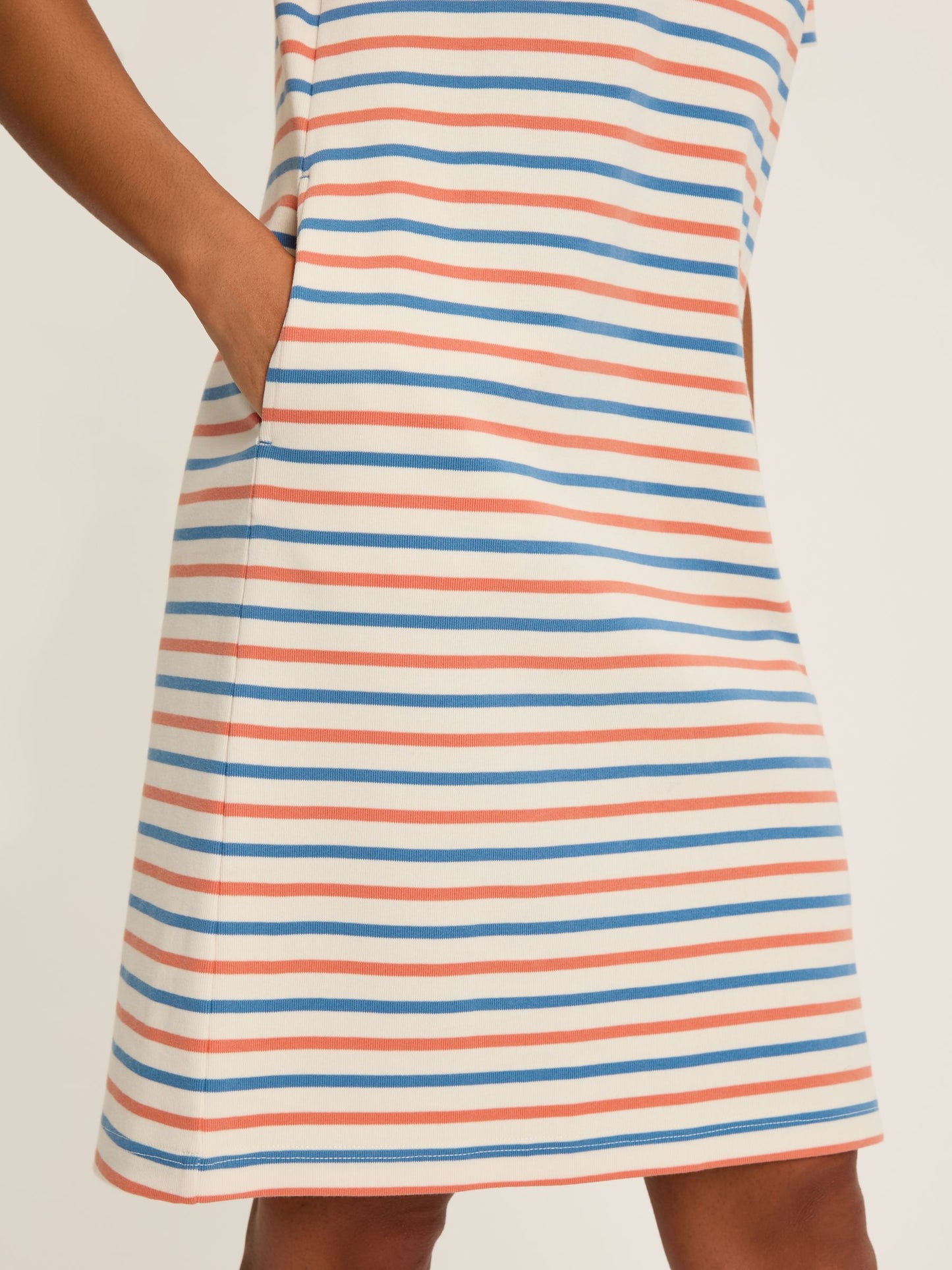 Its a-line shape and nautical stripes add a touch of summer style, while the knee-length, pockets, and versatile design make it perfect for layering. A must-have for any wardrobe this season.