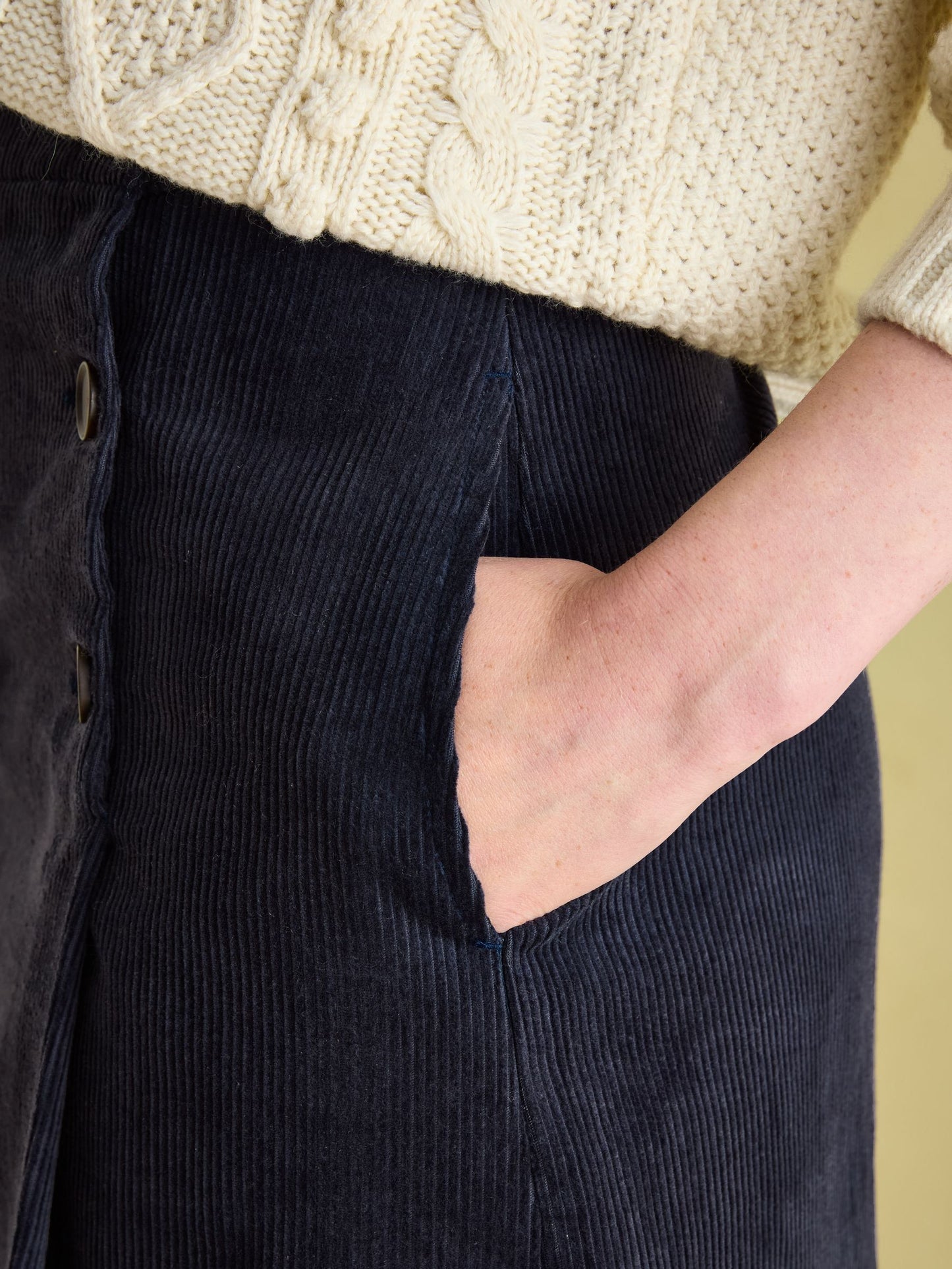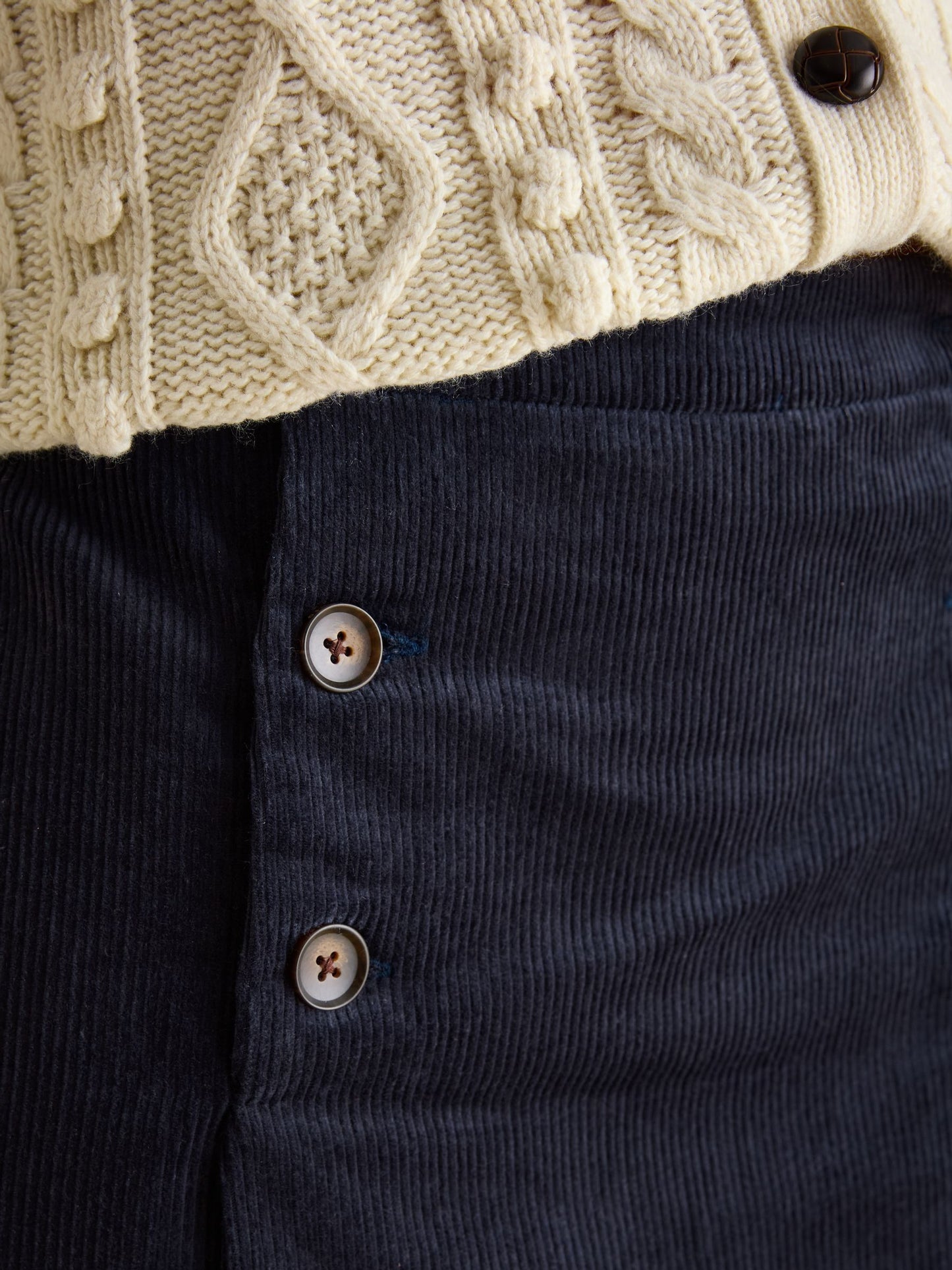 Made from durable corduroy, this A-line skirt features a pleated design and sits just above the knee. The faux horn buttons and side seam pockets add both functionality and style. Embrace the timeless combination of autumn and corduroy with this versatile and practical skirt.