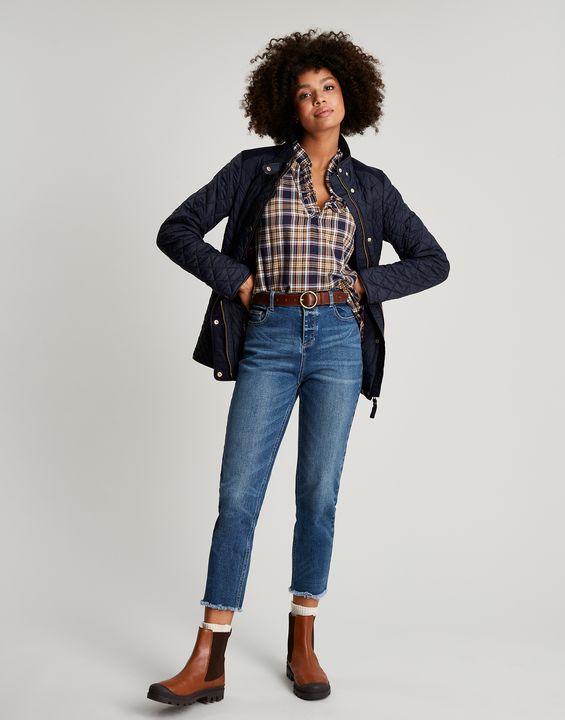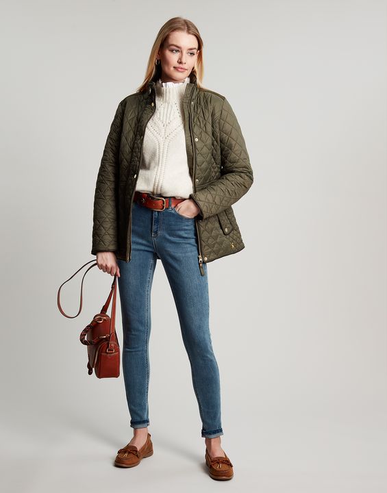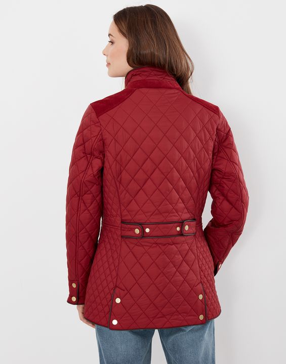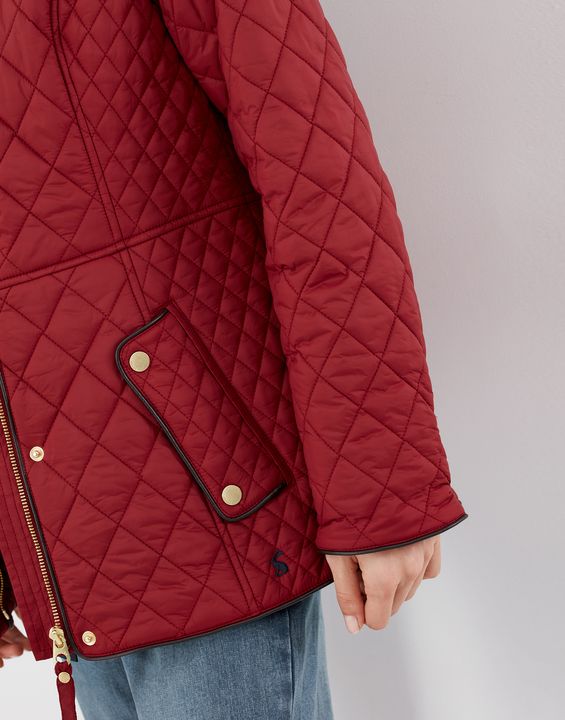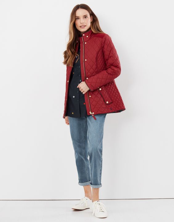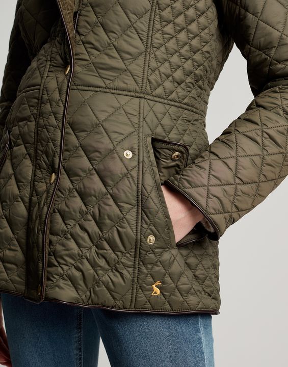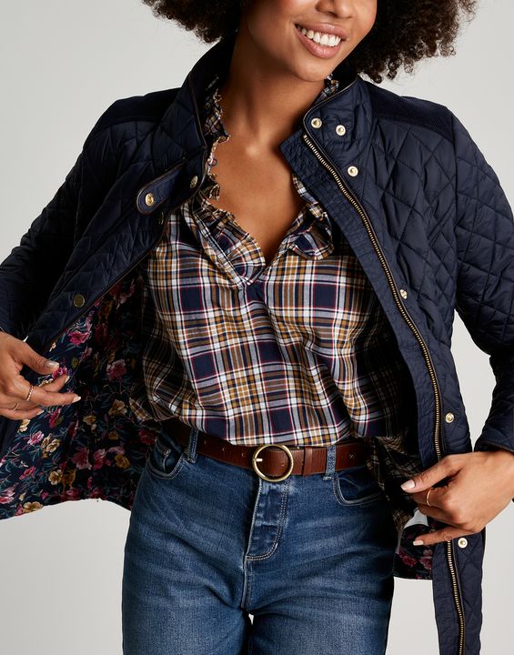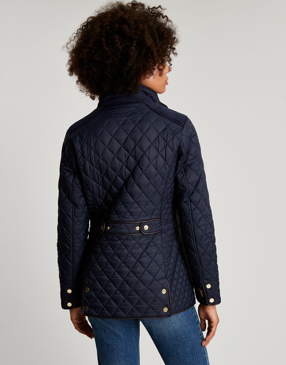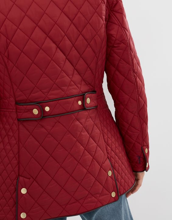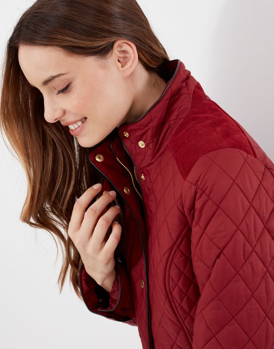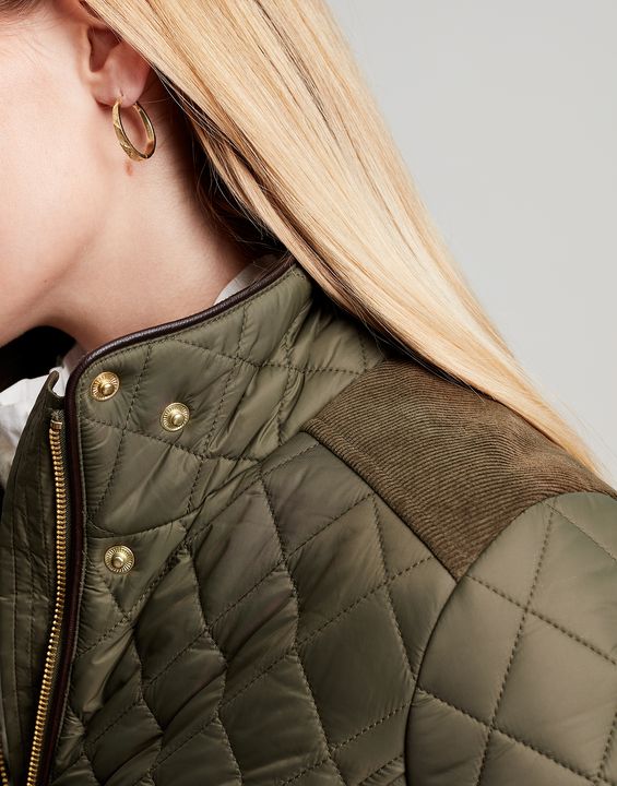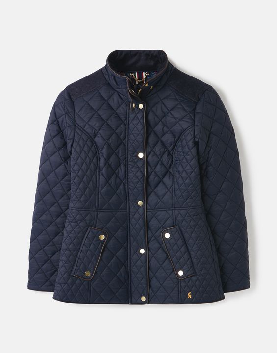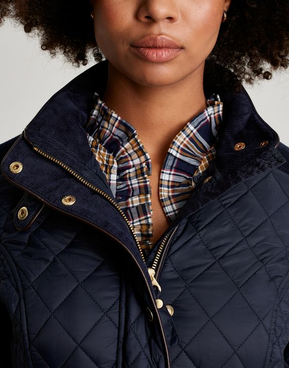 Joules Newdale Quilted Coat is cut with princess seams and a waist seam to create a flattering silhouette, with angled pockets, pleather detailing and premium brass trims.