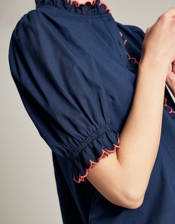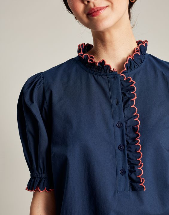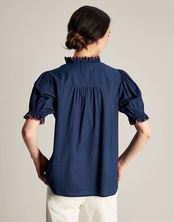 With scalloped detailing to the cuffs, placket and neckline, the short voluminous sleeves make this top perfect for warmer weather. Its button placket adds to the versatility of the blouse, making it easy to customise your look.