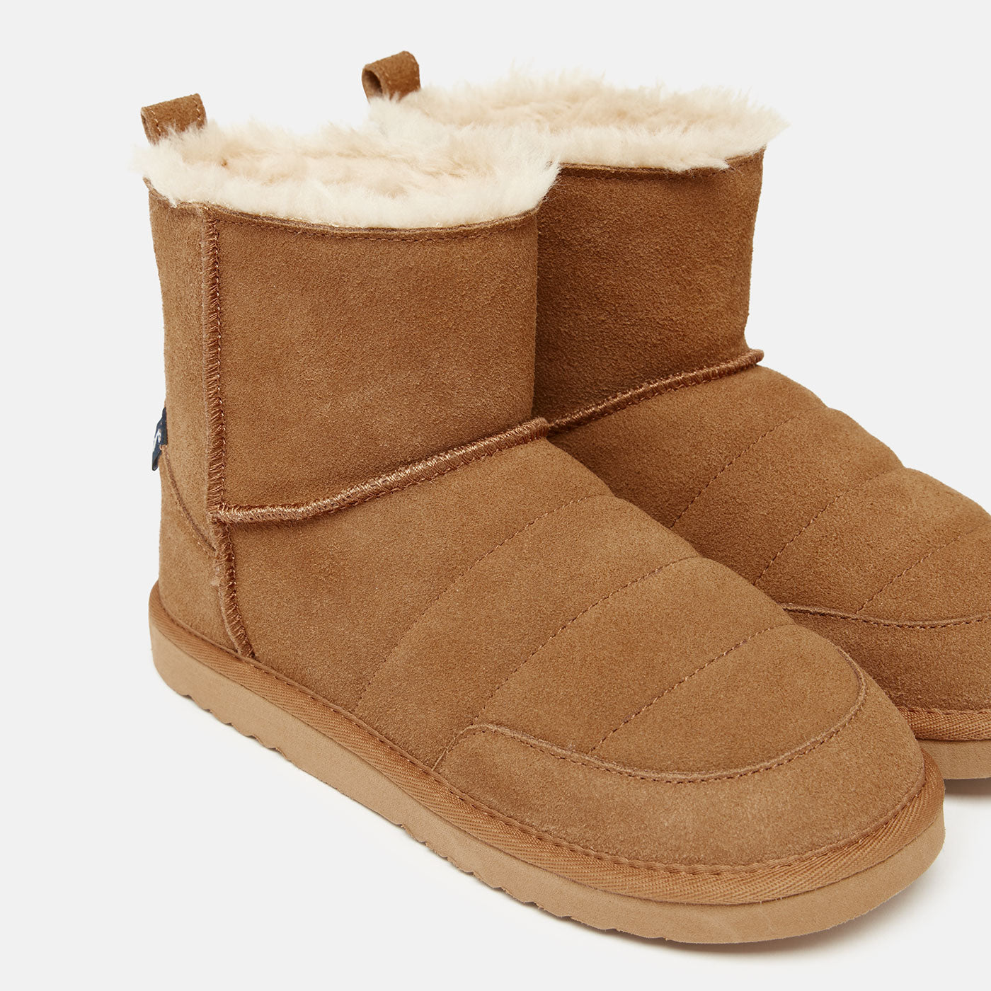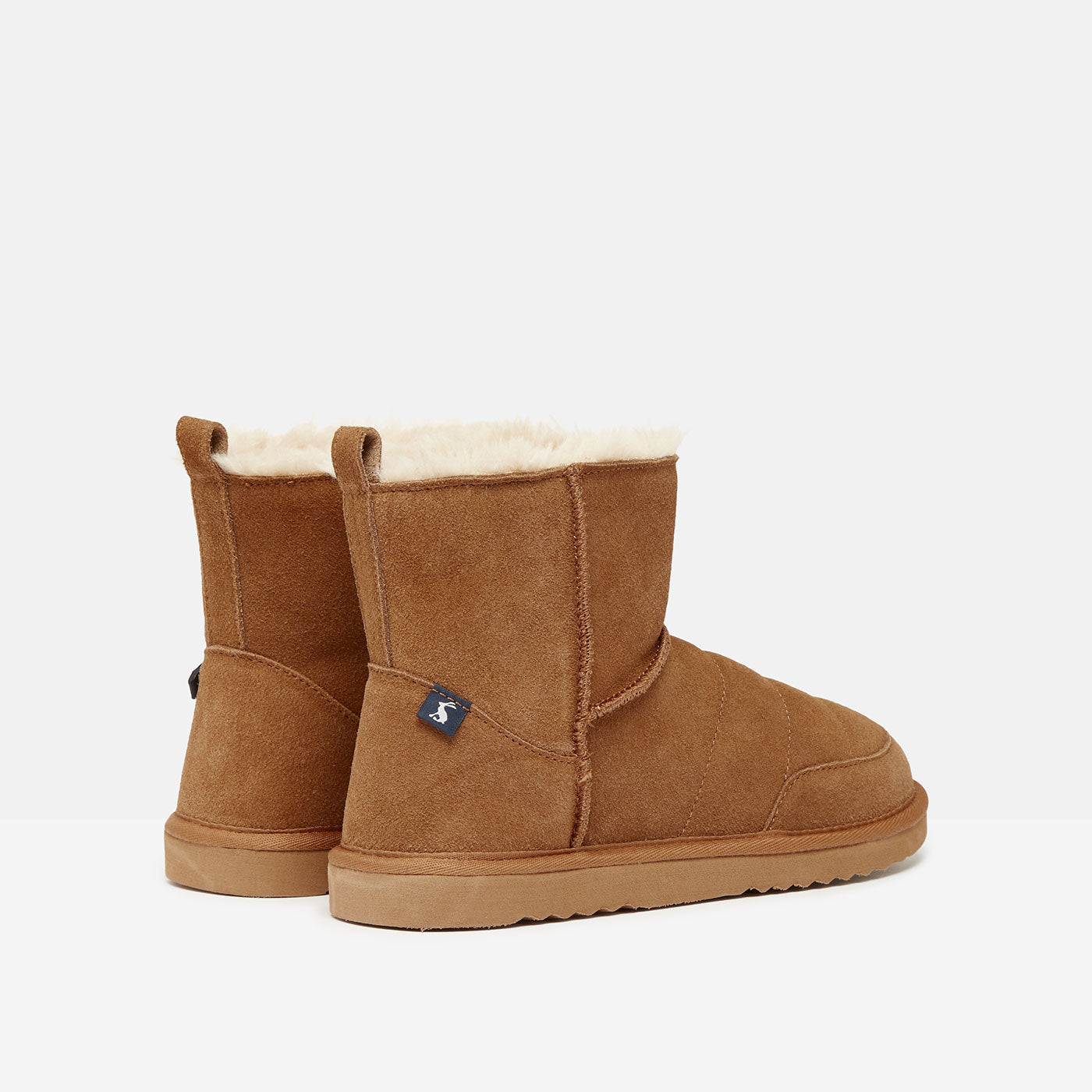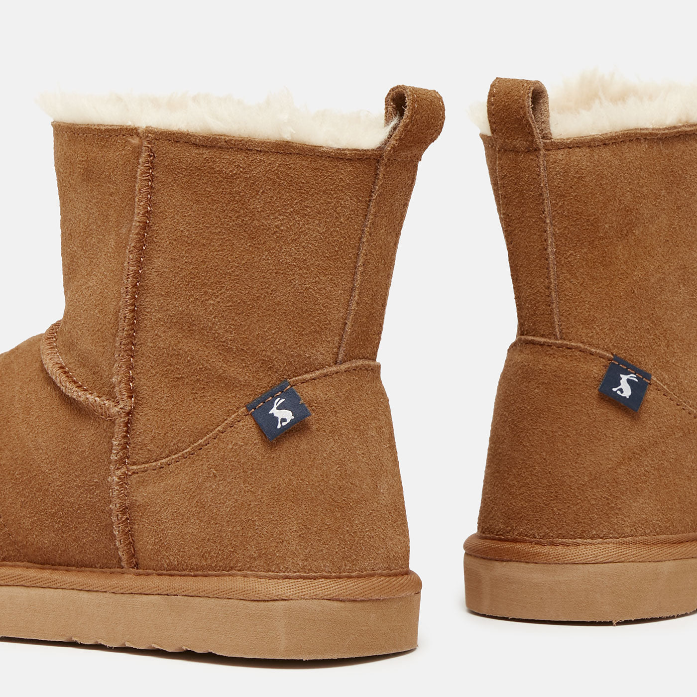 Constructed from luxuriously soft suede with a faux fur shearling lining, these boots keep your feet warm and comfortable. The ridged rubber outsole also ensures secure grip with every step. Plus, the added pull tab and branded Joules hare detail make these slippers a standout.