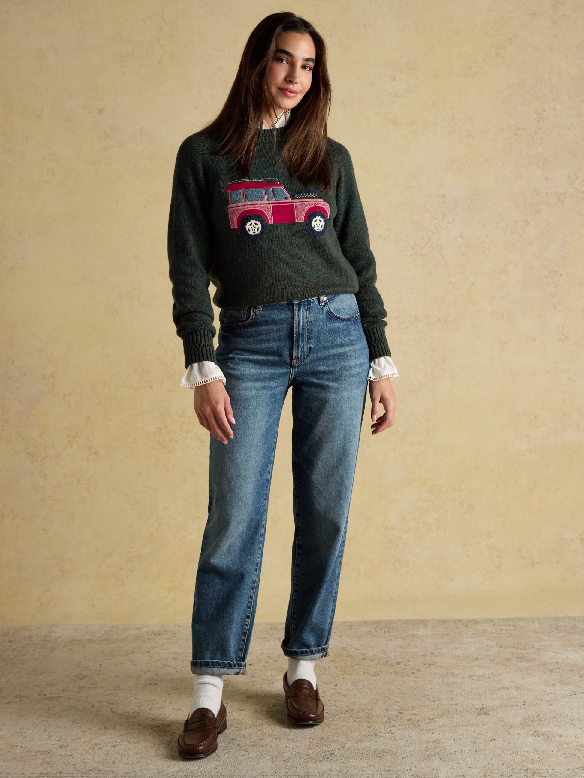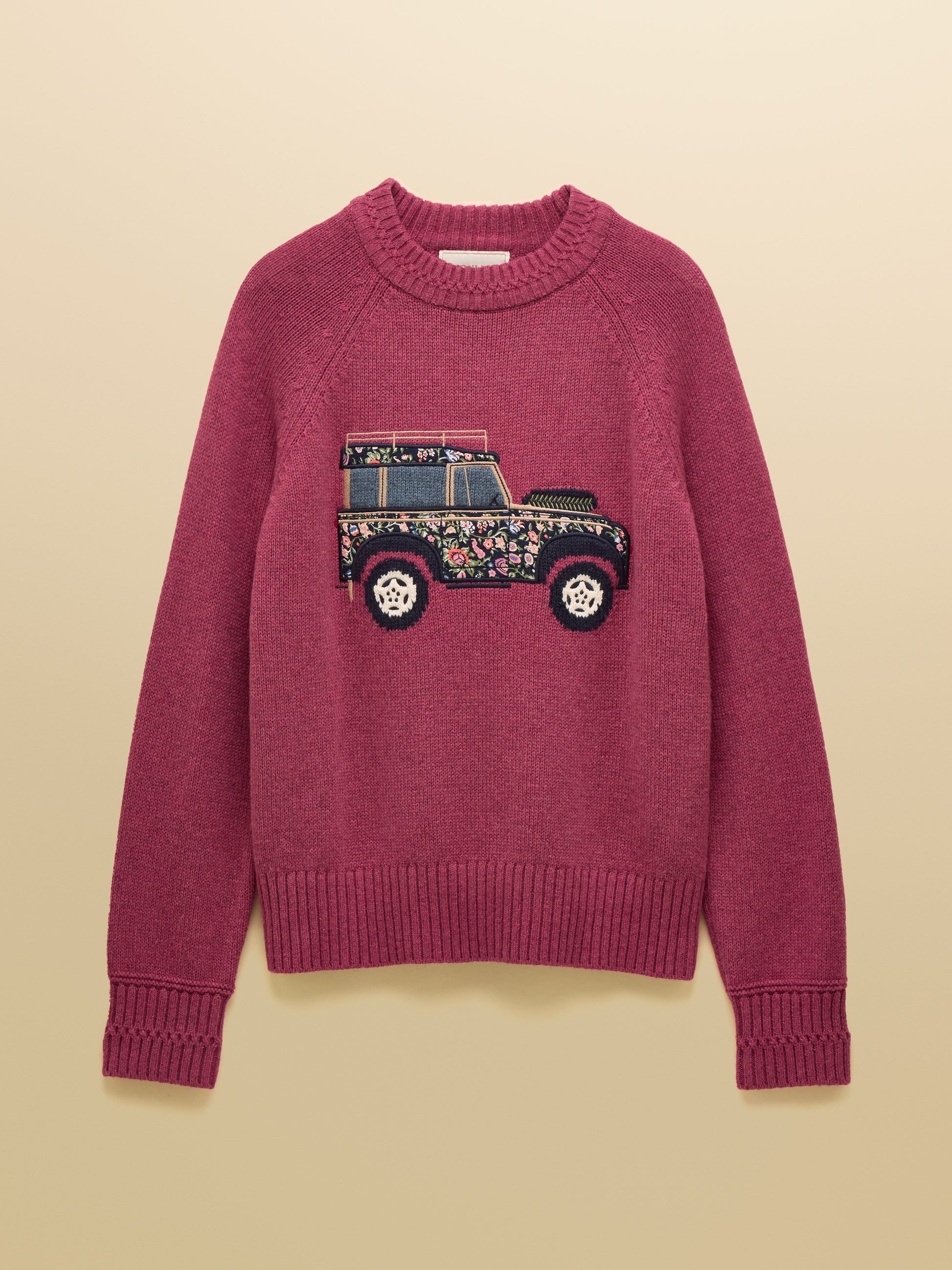 Made from a soft cotton and wool blend, it offers warmth and comfort throughout the colder months. The jumper showcases a detailed intarsia and appliqué 4x4 vehicle motif on the front, adding subtle character. Designed with a ribbed round neck, hem, and cuffs, it layers easily under coats or wears well on its own. Durable and timeless, this piece is ideal for seasonal wear, delivering both style and lasting quality.