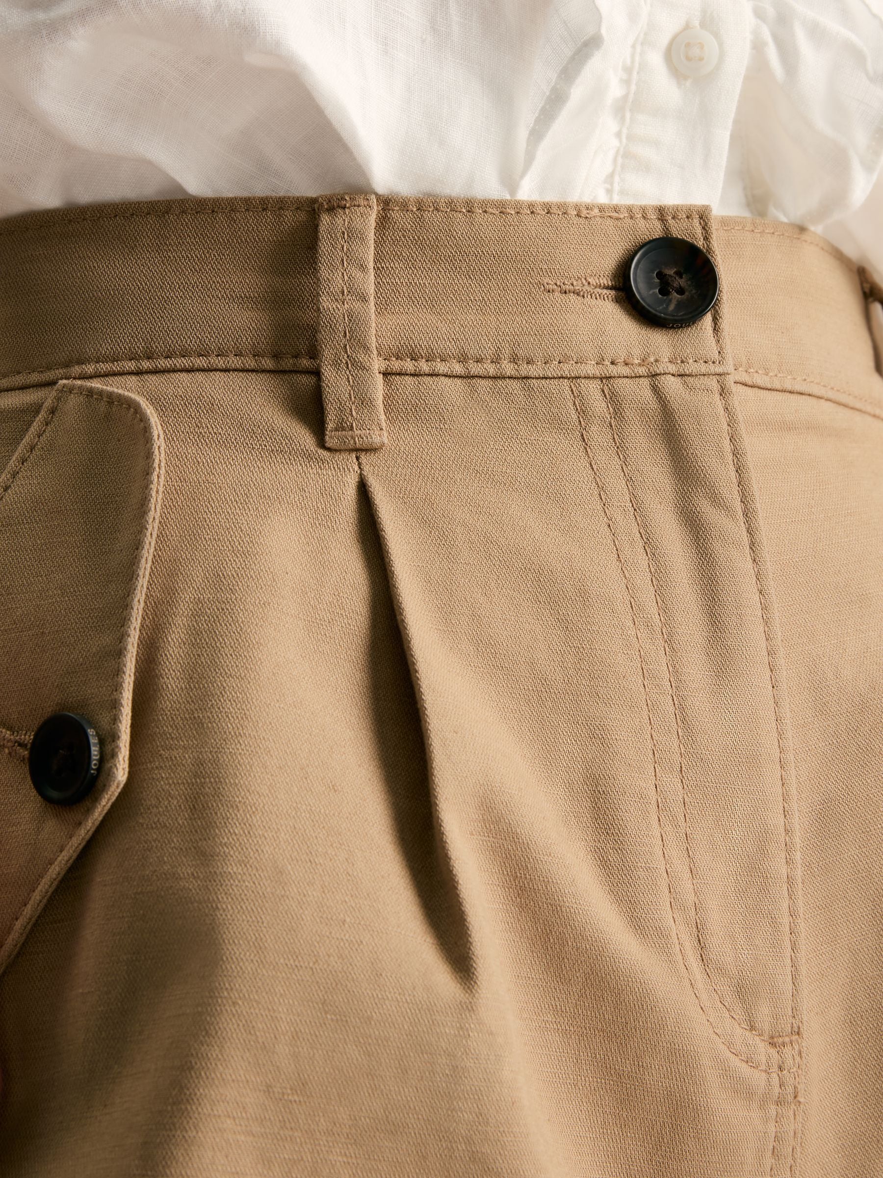 Inspired by safari fashion, they feature a neutral colour, utility look and sun-ready fabric. Made from a light cotton and linen blend, they offer a flattering mid-rise waist and plenty of pockets. The elasticated back waistband and belt loops provide a comfortable and customizable fit. Perfect for warm weather adventures.