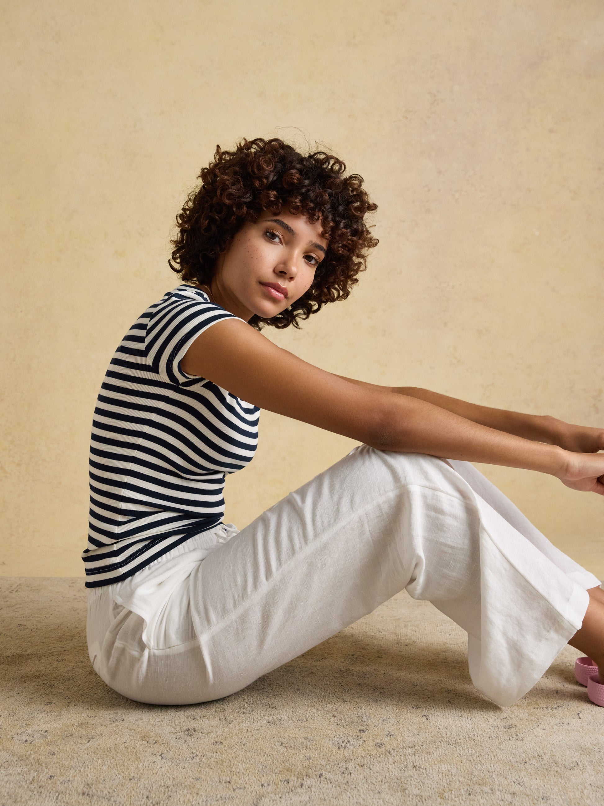 Its fitted silhouette flatters the frame, whilst distinctive stripes and a classic crew neckline deliver understated style. Constructed from a soft, cotton-rich ribbed fabric, this piece offers superior comfort and durability that withstands regular wear. The structured ribbing provides subtle texture and shape retention, making it an ideal foundation for layering or wearing solo. Pair effortlessly with denim, linen trousers, or skirts for a polished, relaxed aesthetic. A wardrobe essential that transcends seasons and trends.