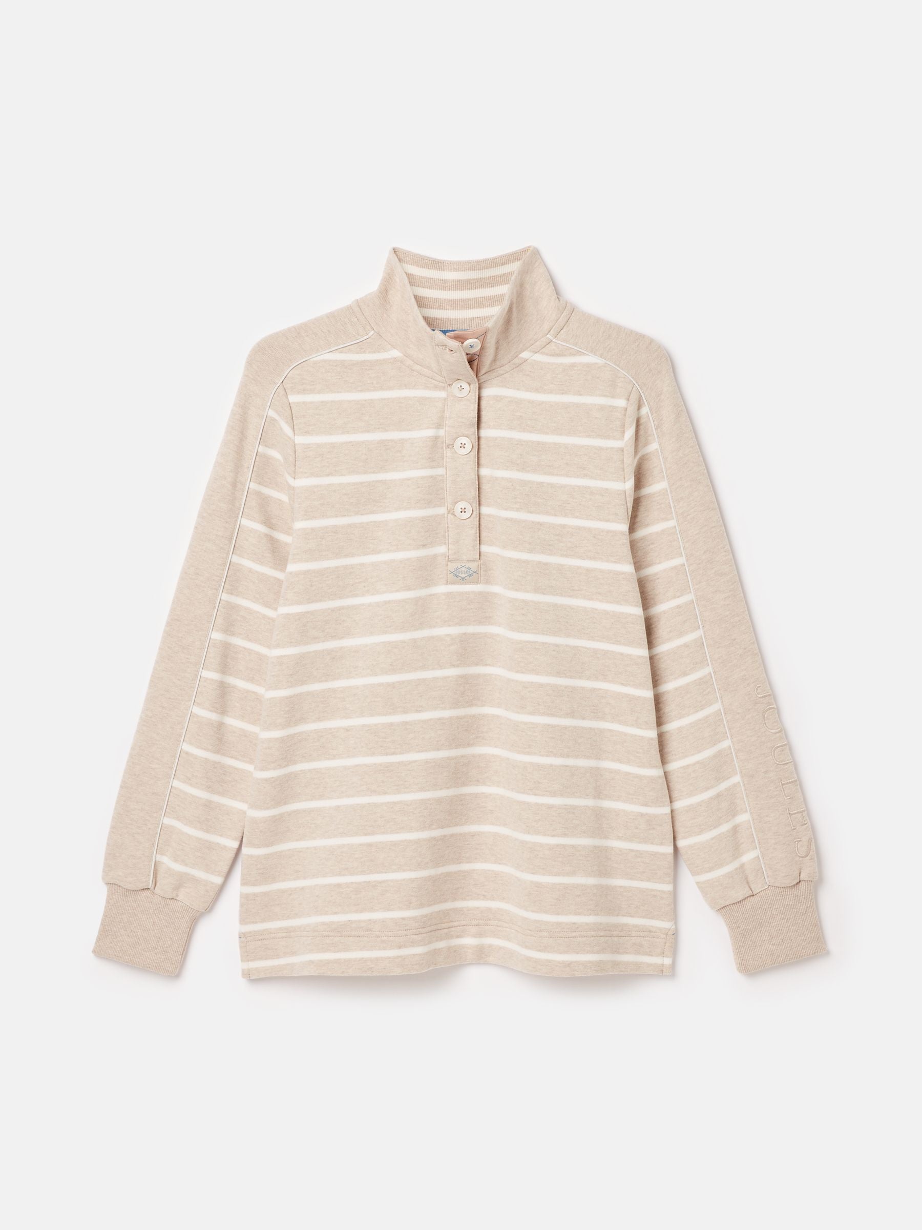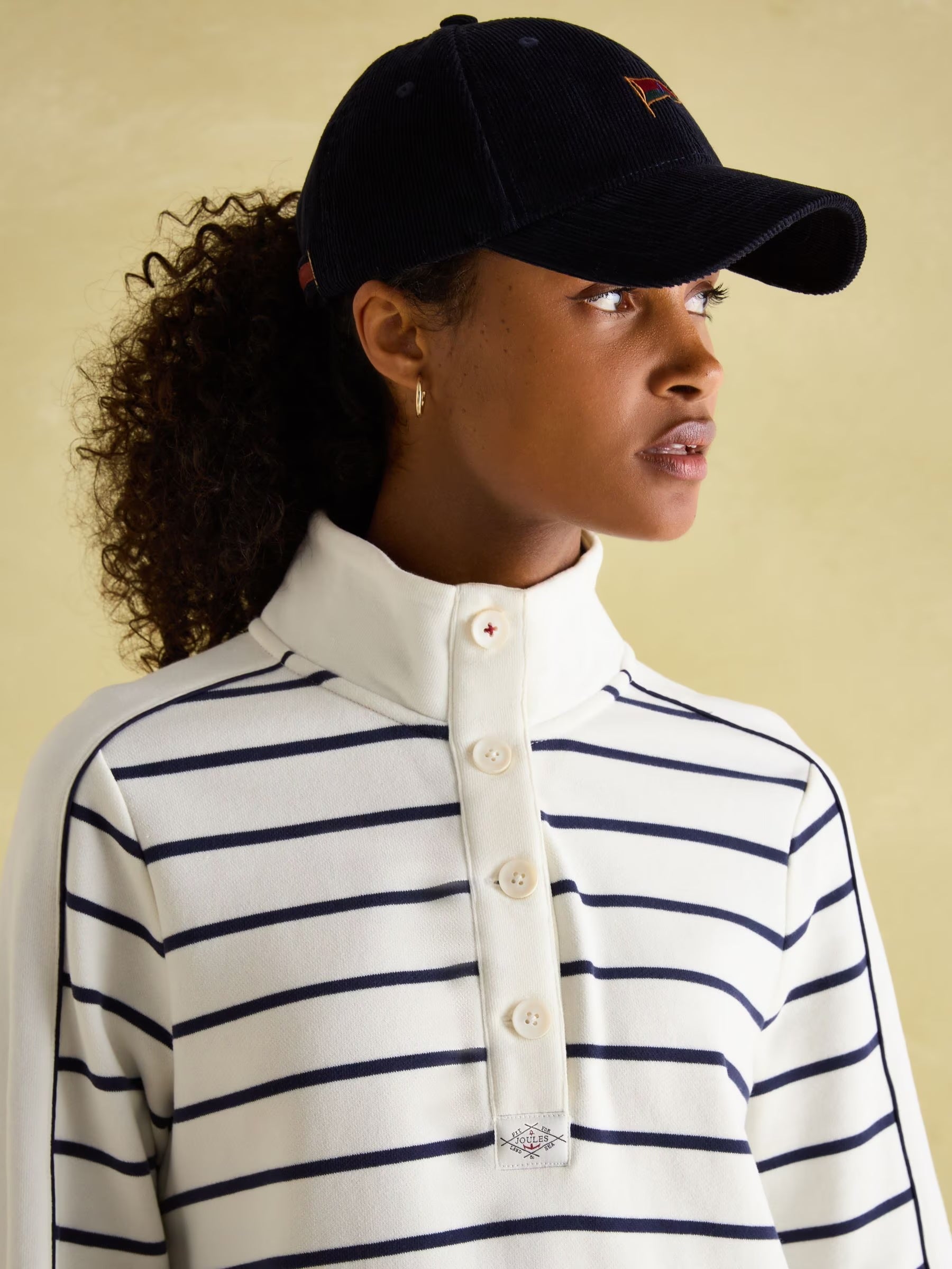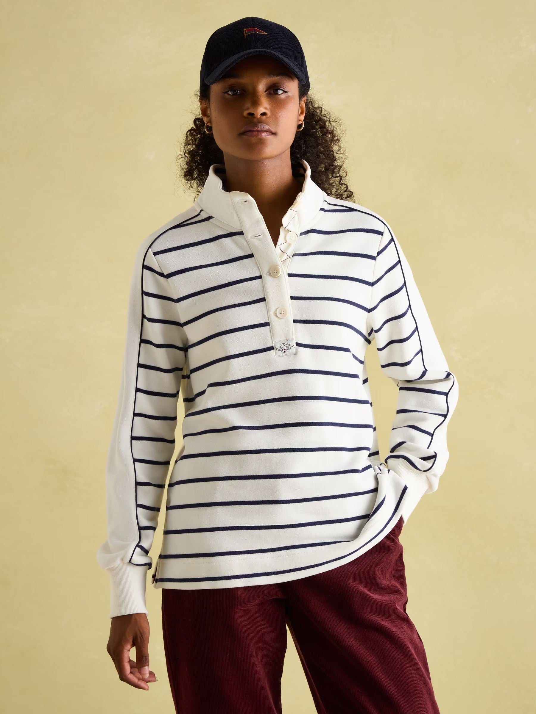 Joules Southwold Sweatshirt is crafted from a hardwearing jersey and has a funnel neck and button placket. The drawcord ties have been dipped in contrasting colours that match the small embroidered hare to the chest. There are side splits for more unrestricted movement, ribbed hem and cuffs and stripes to elevate your everyday look. Hare and joules script embroidered branding.