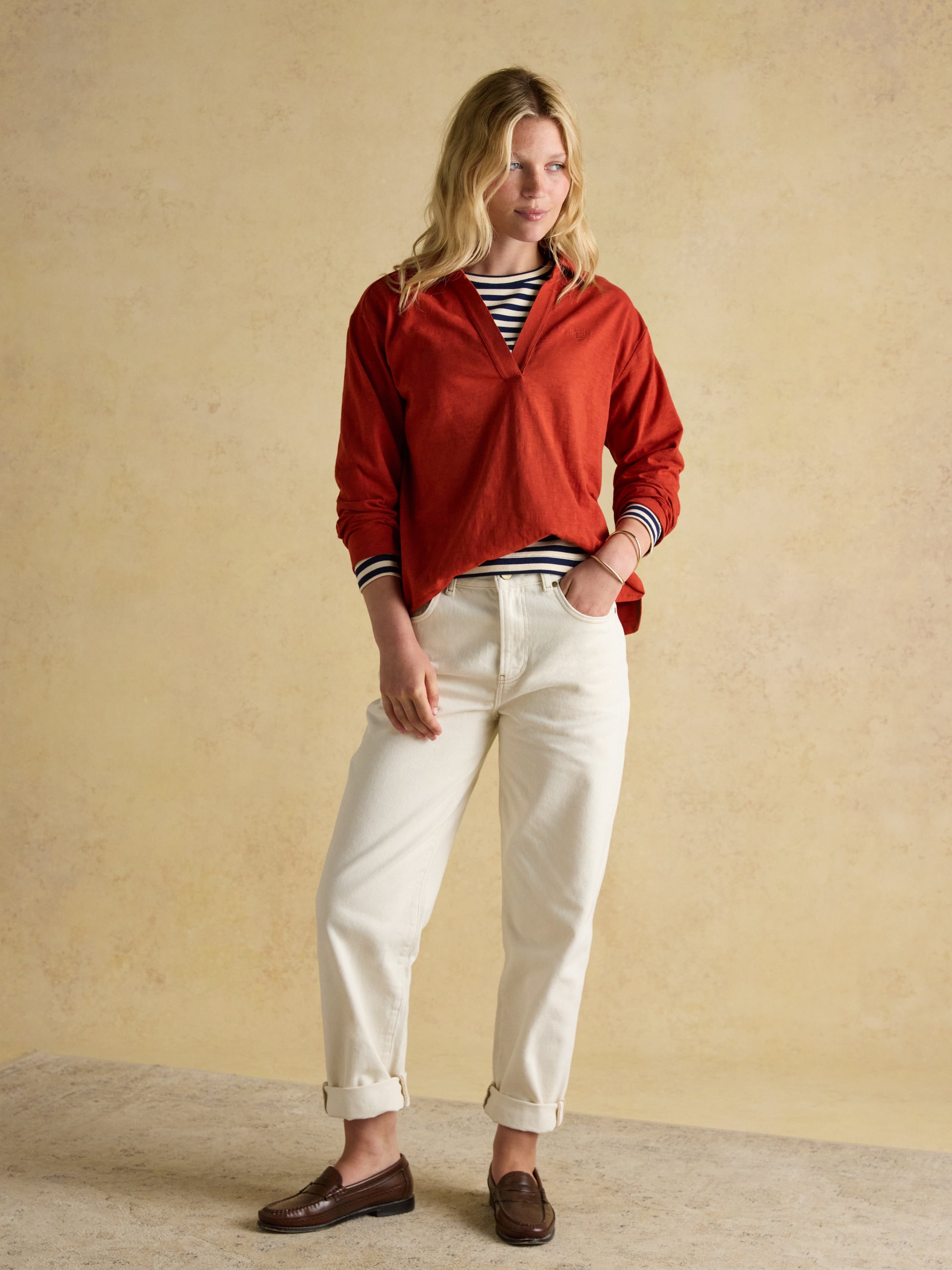 Made from soft, durable combed cotton slub fabric, it offers a flattering, relaxed fit that suits multiple seasons. Its versatile design makes it ideal for both casual and polished looks, whether at home or out and about. Available in a range of colours, this top is a reliable wardrobe staple you’ll reach for time and again.