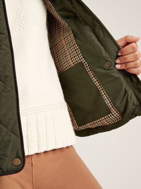 Its diamond quilted design and wadding fill provide superior warmth, while its water-resistant finish keeps you dry in light rain. The adjustable back tab, concealed zip and popper fastening, and corduroy piping at pockets and armholes create a classic and comfortable countryside style. Finished with a heritage-checked lining.