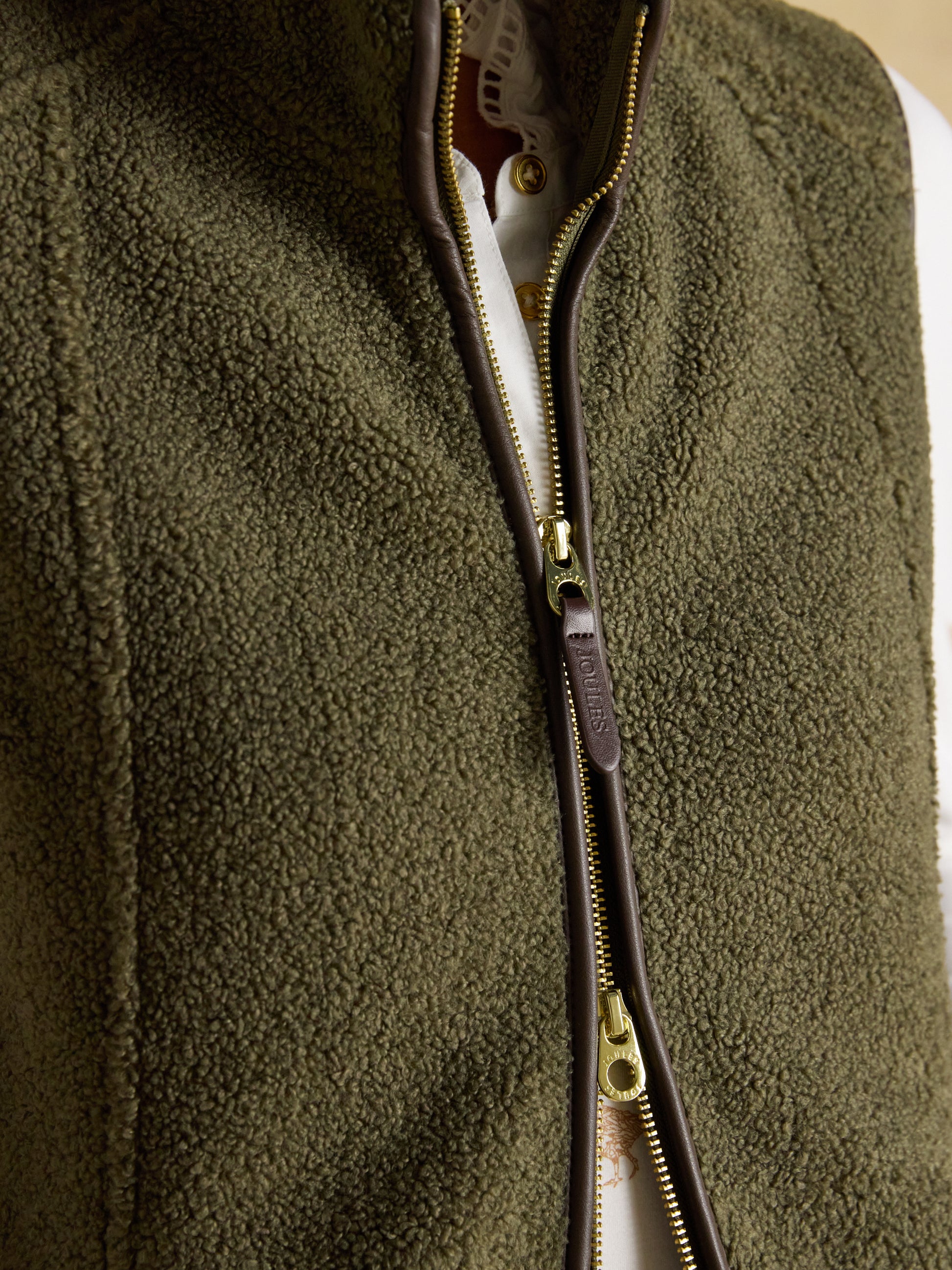 This luxury borg fleece piece features a classic silhouette enhanced by an internal waist adjuster for a flattering fit. The full-zip front and warming stand collar provide practical layering versatility, whilst stylish contrast faux leather trims and signature engraved hardware elevate the aesthetic. Complete with popper pockets and iconic Joules embroidery at the back neck, this gilet transitions effortlessly from countryside walks to everyday errands. Whether worn as a standalone layer or paired with other pieces, it's a refined wardrobe essential designed for lasting appeal.
