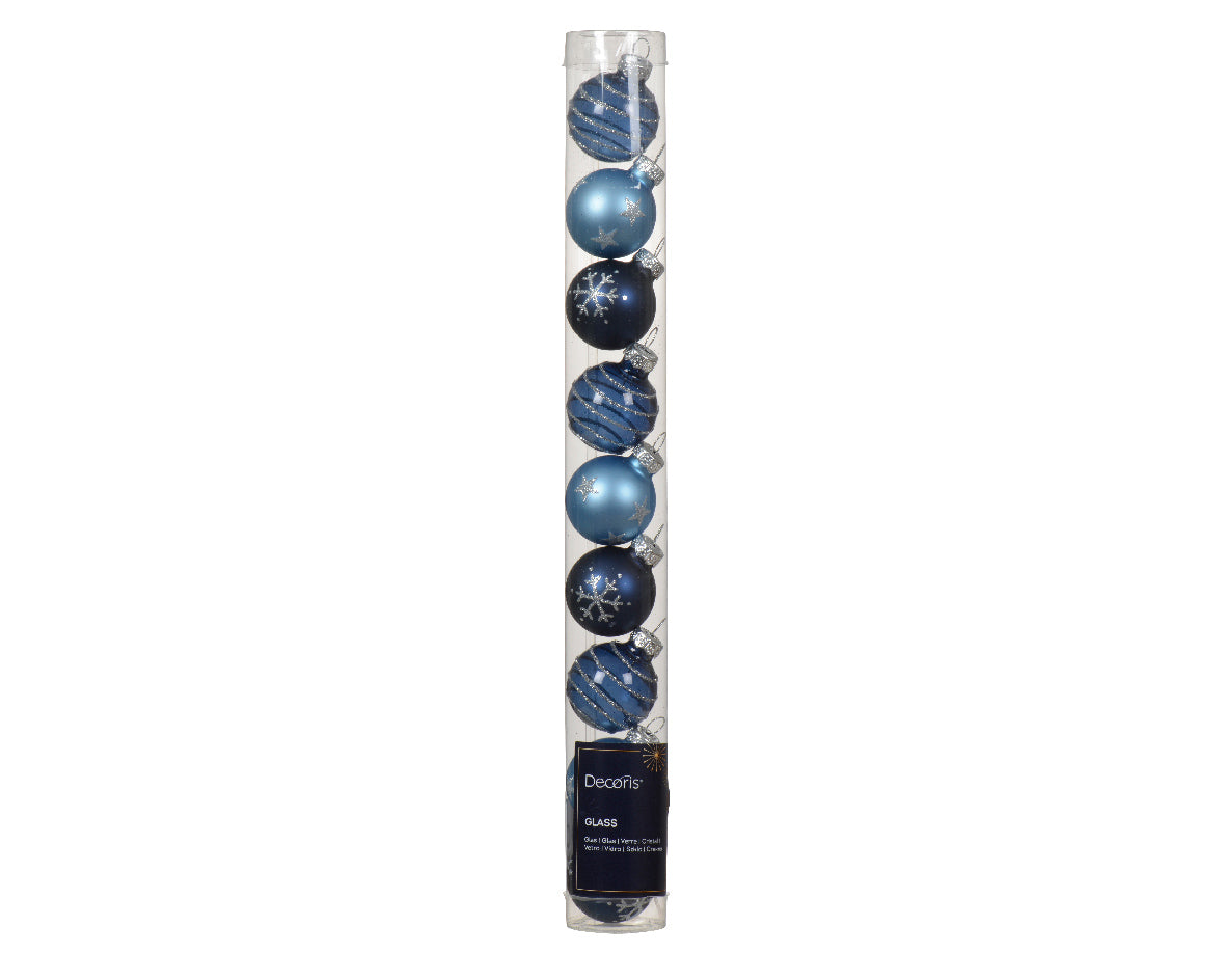 This pack of 9 features glass transparent enamel with a beautiful blue colour and intricate star and snowflake designs. Add a touch of elegance and charm to your Christmas tree this season.