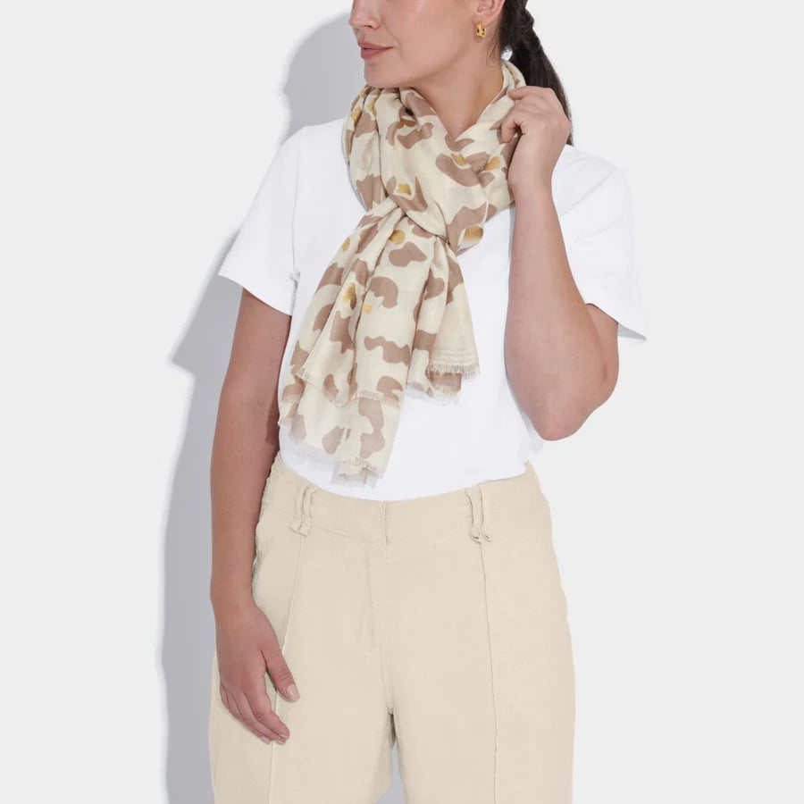 Katie Loxton’s scarf exudes luxury, crafted from lightweight beige polyester.