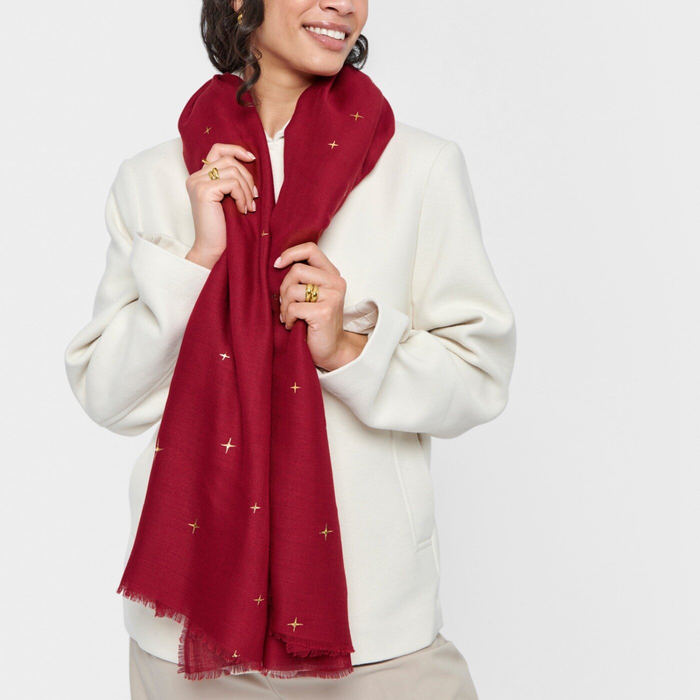 Elevate your style with the Katie Loxton Star Sky Printed Foil Scarf.