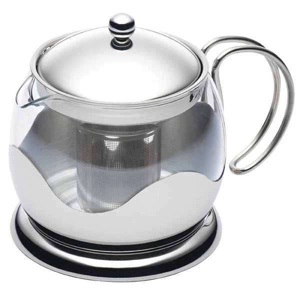 Contemporary style borosilicate glass teapot with an integral removable stainless steel infuser and lid, with an easy to hold handle. The integral, removable stainless steel infuser allows loose leaf tea to brew naturally, giving a true full flavour.