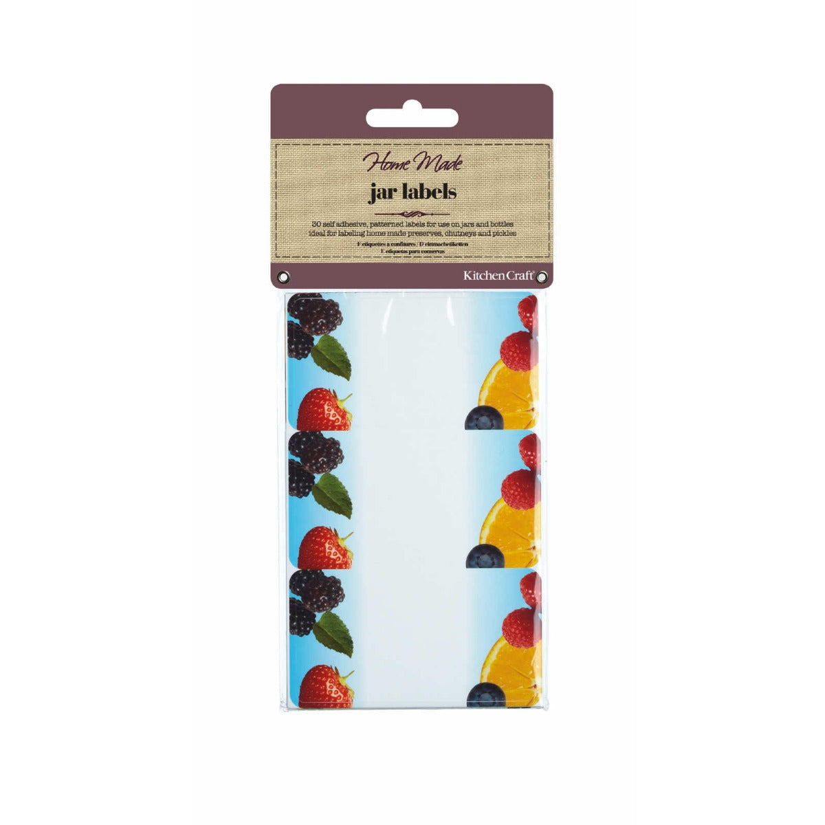 Home made pack of thirty self-adhesive jar labels for personalising preserving jars, bottles, food packs, and parcels. Includes ten labels in each of the three separate colours, all in an attractive fruit pattern.