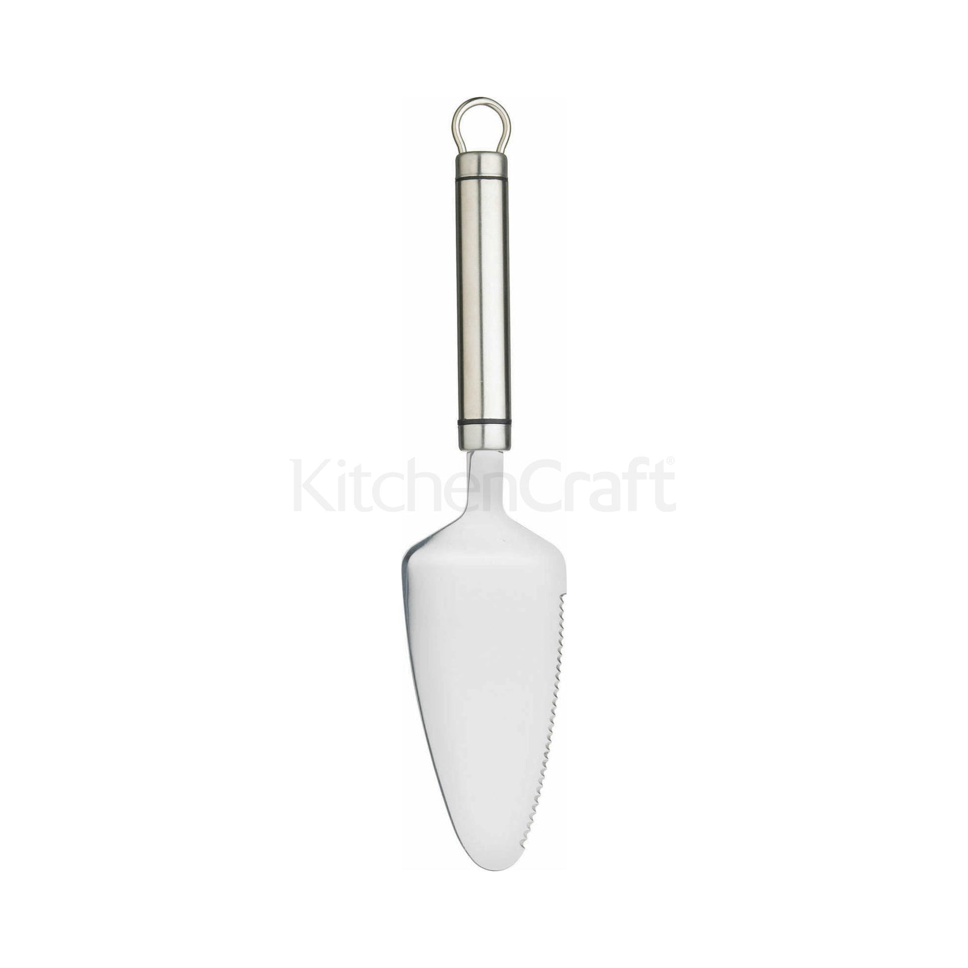 Kitchen Craft high quality stainless steel cake server, with a serrated blade to one side, a comfortable oval shaped handle, and an integral hanging storage loop.