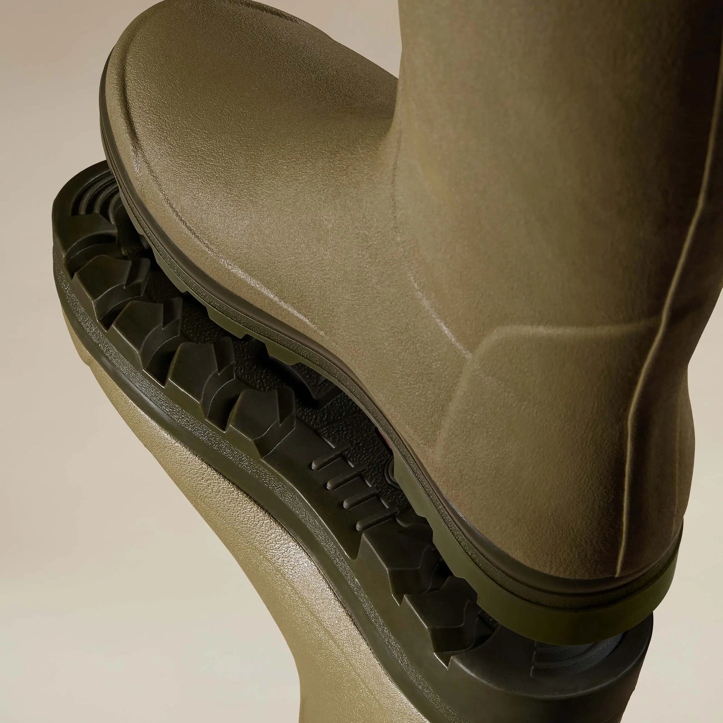 Handcrafted from natural rubber with a 3mm neoprene lining for comfort in cold weather. Adjustable waterproof gusset with snap-fastening buckle to ensure a comfortable fit around the calf and leg. Shock absorbing and anti-fatigue dual-density Grip outsole resists abrasion and is suitable for all terrains.