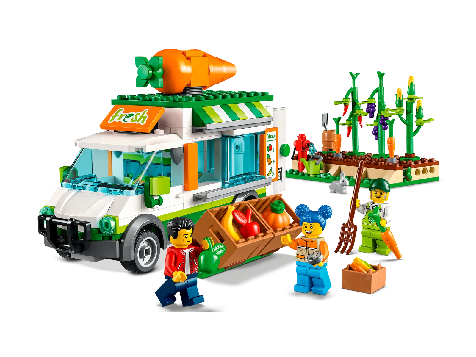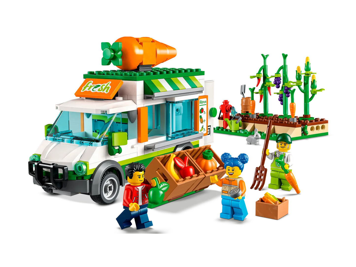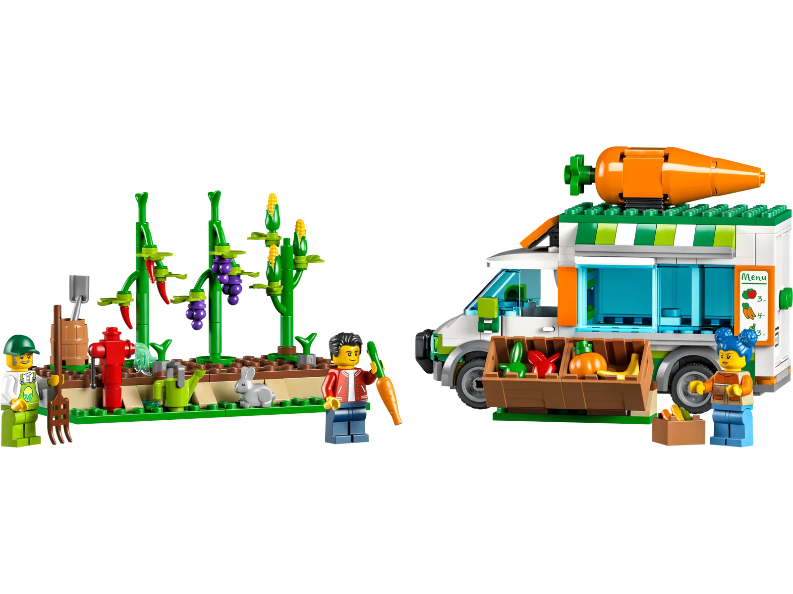 - What’s in the box? – All kids need to build a mobile farm shop and veggie patch, with lots of play-inspiring features, plus 3 minifigures, including a LEGO City TV character, and a rabbit figure
