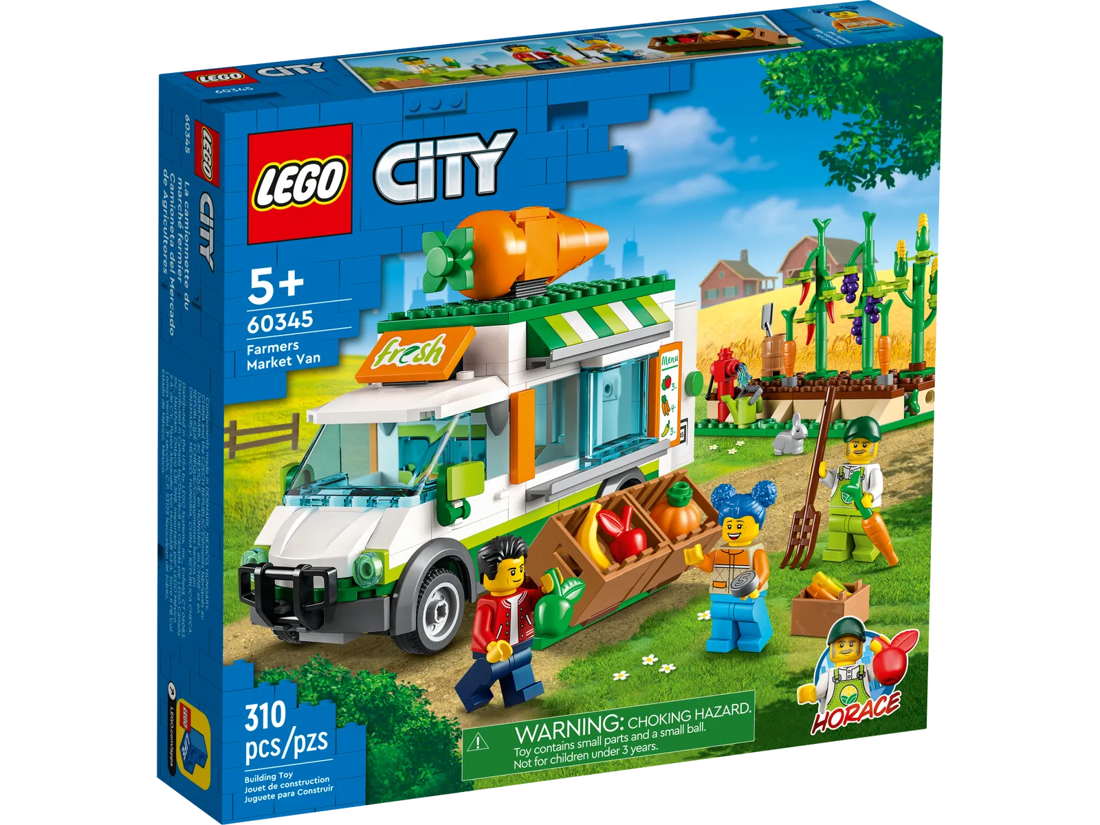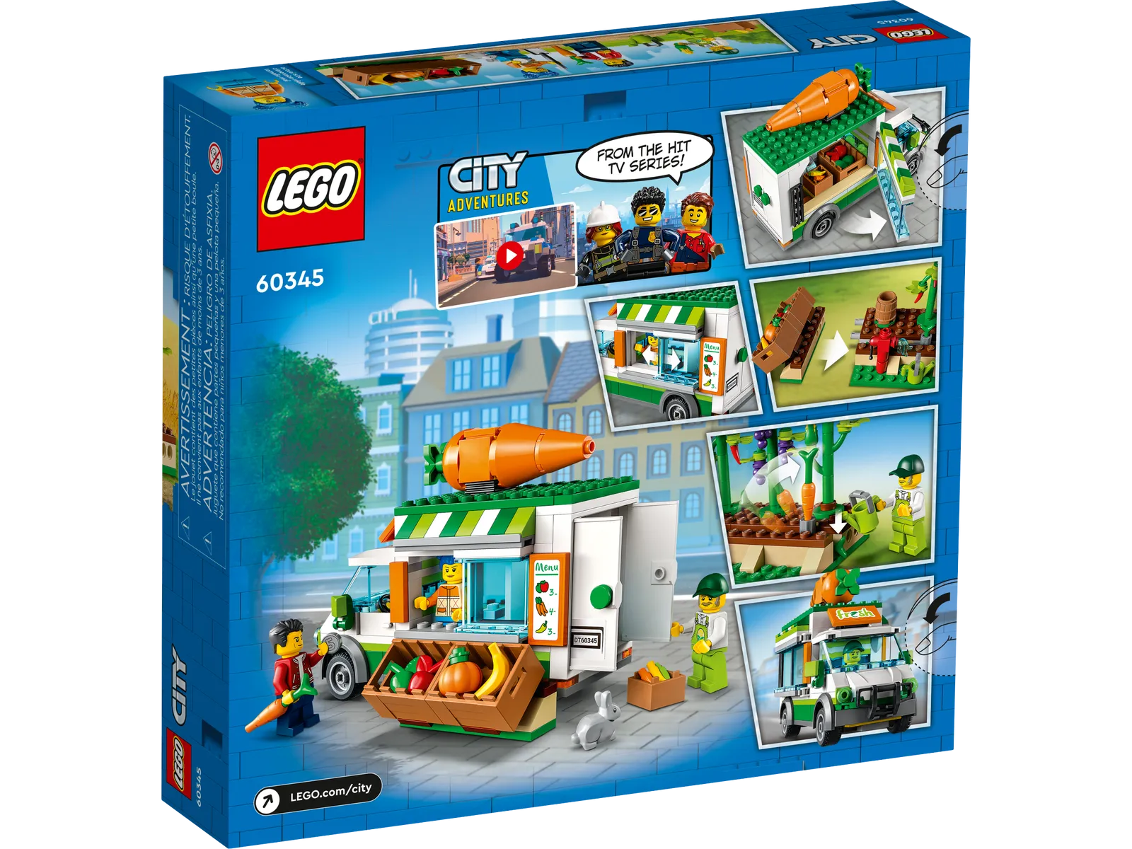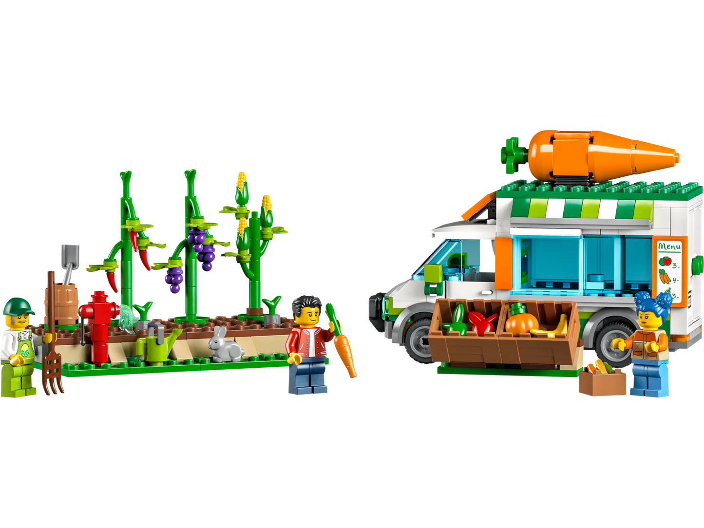- What’s in the box? – All kids need to build a mobile farm shop and veggie patch, with lots of play-inspiring features, plus 3 minifigures, including a LEGO City TV character, and a rabbit figure