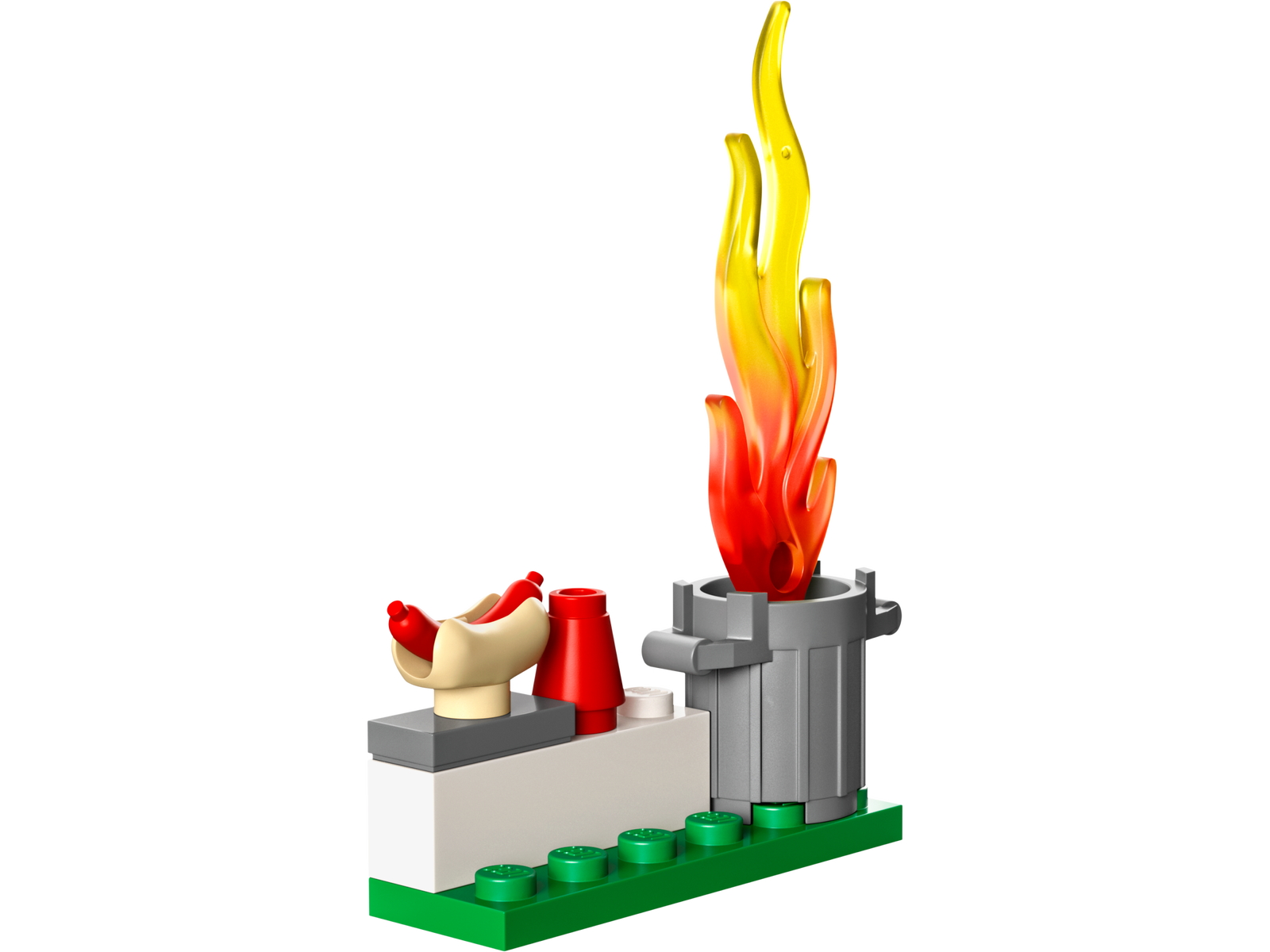 Featuring a toy helicopter with a storage compartment and spinning rotors, plus firefighter and hotdog vendor minifigures. Just add the garbage can, LEGO flames and burnt hotdog for hours of imaginative play.