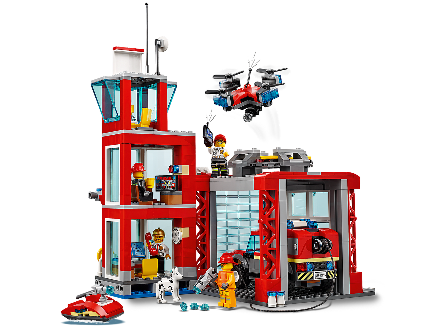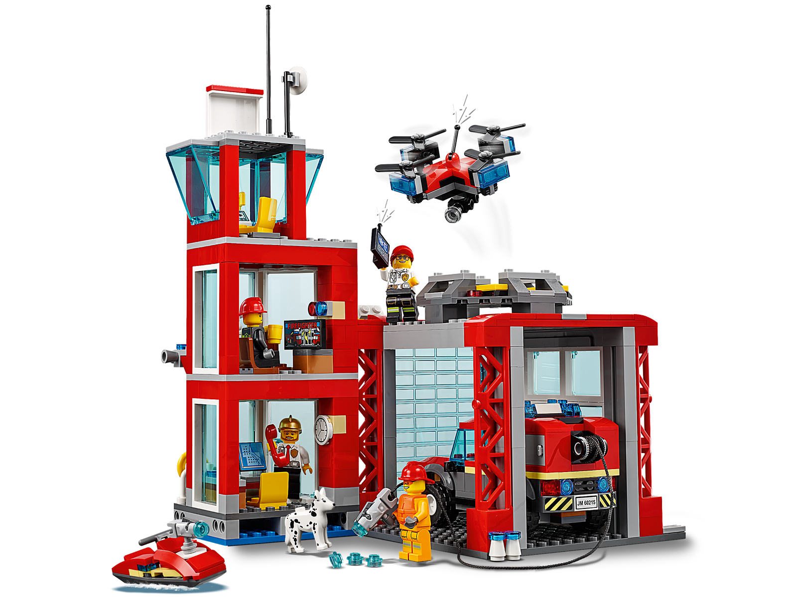 Protect the citizens of LEGO City with the action-packed 60215 Fire Station, featuring a 3-level fire station with office, relaxation room and scout tower, small waterside dock and a separate garage with a large opening front door and a landing pad for the detachable scouting drone with spinning rotors and camera. This cool set also features a fire off-road vehicle with a stud-shooting fire hose and new-for-January-2019 working light and sound brick, plus a water scooter, 4 minifigures and a fire station dog figure.