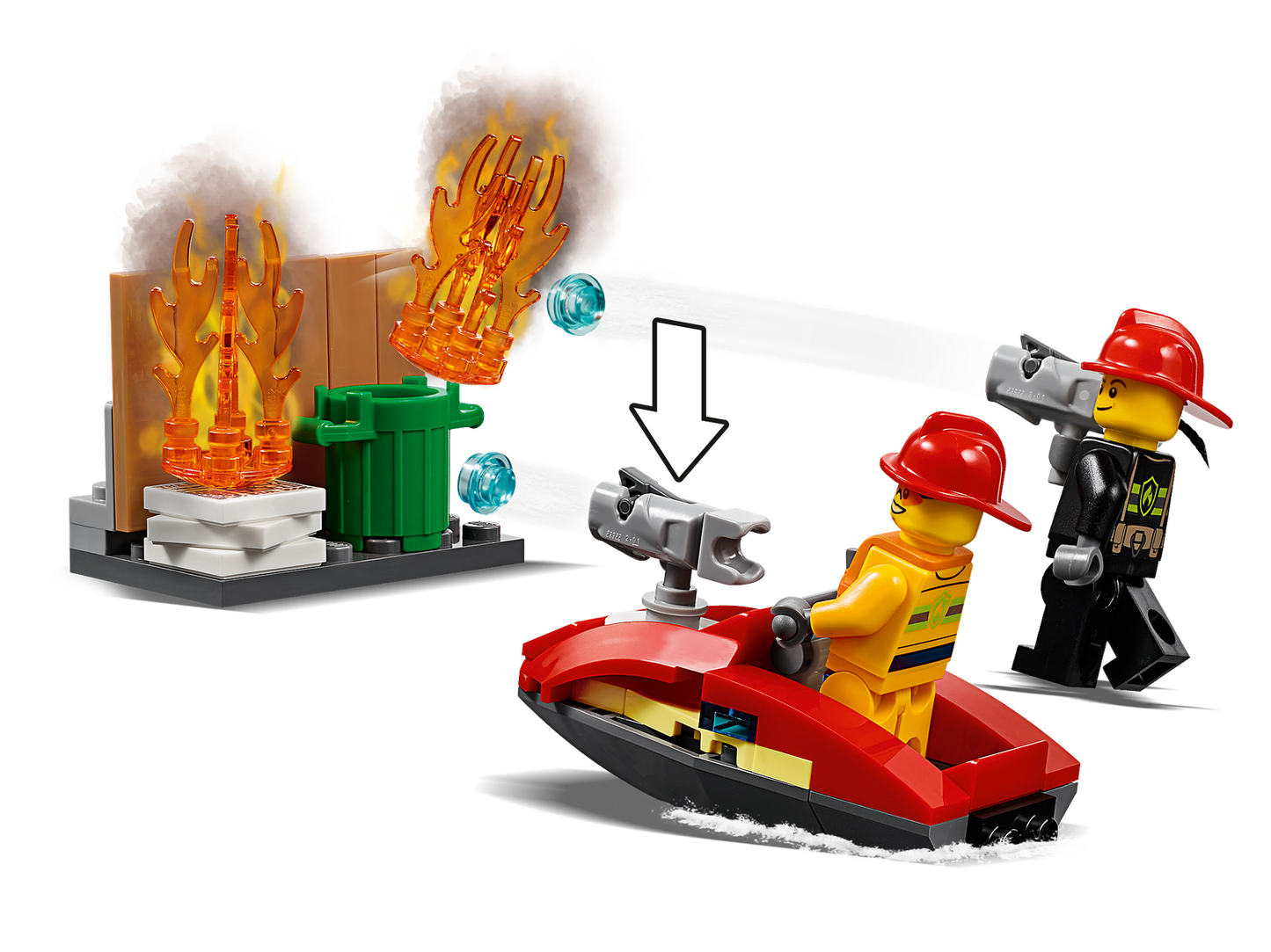 - This cool set also features a fire department off-road vehicle with new-for-January-2019 working light and sound brick, working fire hose with lever and storage compartments, plus a water scooter with space for a stud-shooting fire extinguisher and a scouting drone with spinning rotors and a rotating camera.