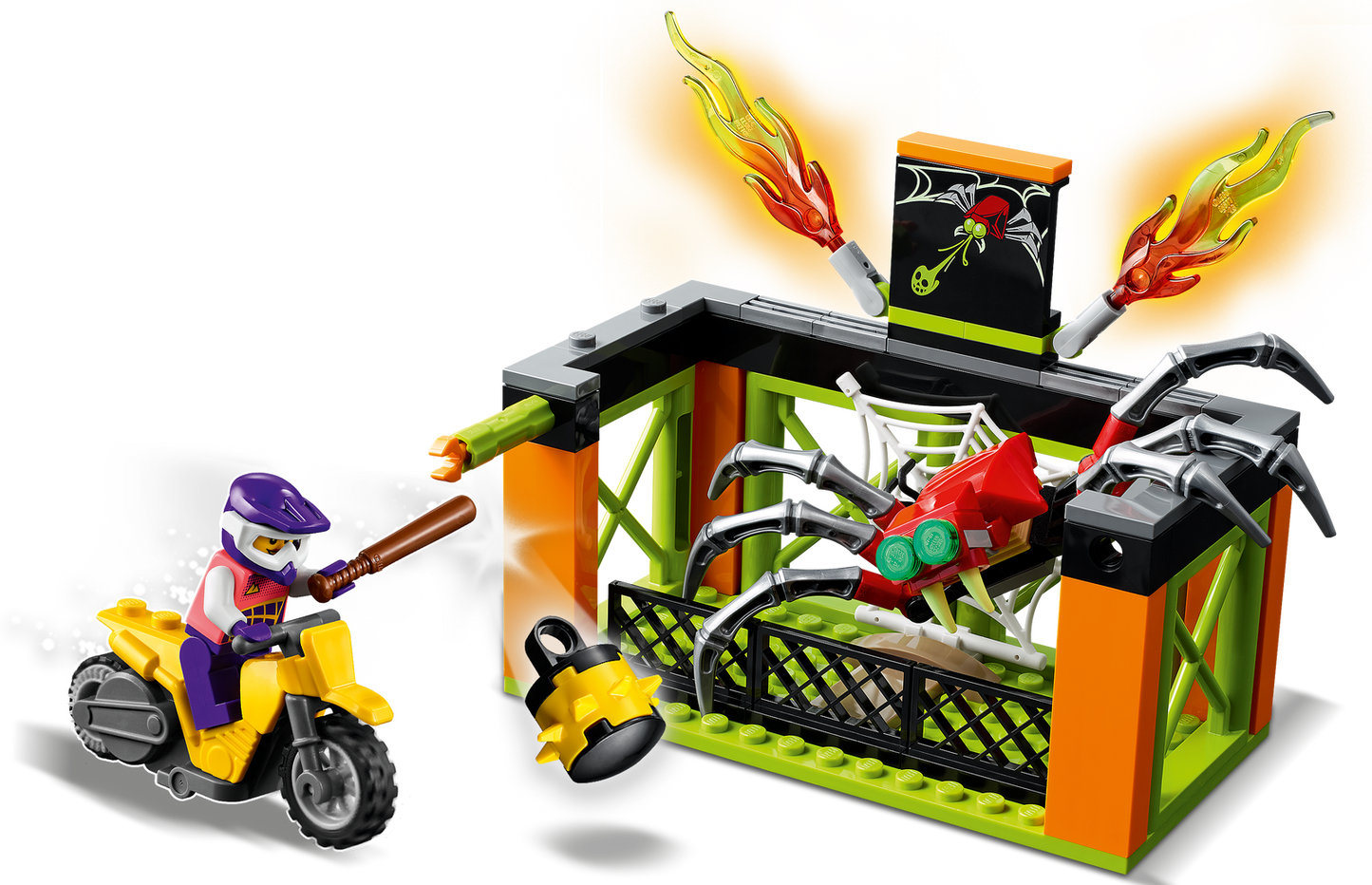 - What’s in the box? All kids need to build a modular toy stunt park with 2 launch ramps, obstacles, fire, spider cage and a flywheel-powered stunt bike, plus a LEGO City TV Tread Octane minifigure.