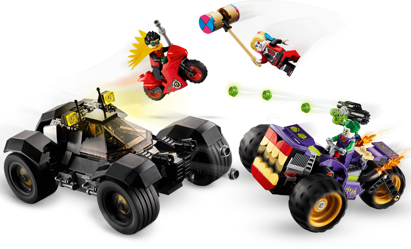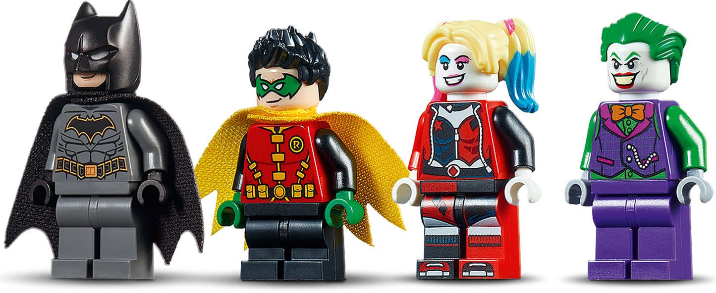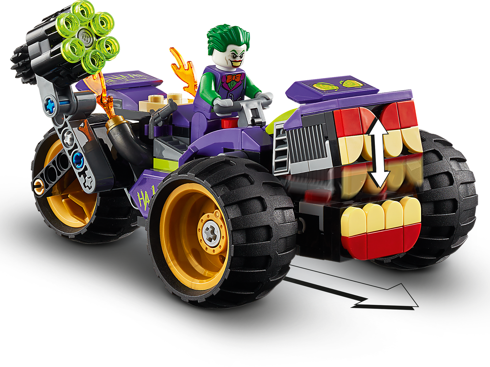 Put Batman action and adventure into the hands of young super heroes with THE JOKER's monster 3-wheel trike toy, with its cool weapons and flames coming from the exhaust, and the ultra-cool Batmobile car. With Batman, Robin, THE JOKER and Harley Quinn minifigures,the pretend play starts right away. And with cool features, including the opening and closing mouth on the front of THE JOKER’s trike and the removable Batmobile engine that also turbocharges the trike, the imaginative play will never end.