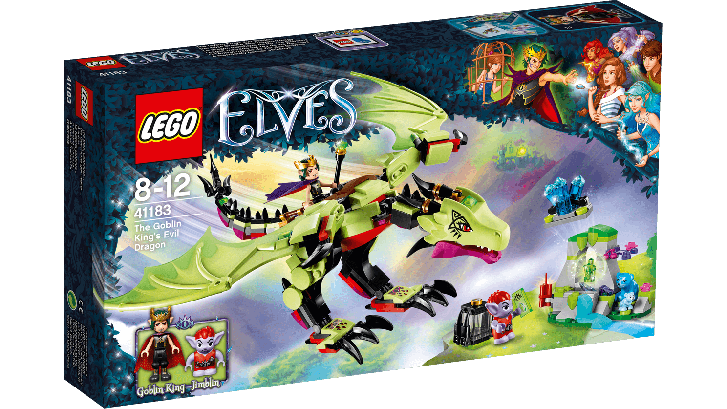 Includes a Goblin King mini-doll figure, plus Ashwing the earth dragon, Jimblin the Goblin, Blubeary and Lil’ Blu.Ashwing features posable wings, wing claws that can grip, and space for the Goblin King and Jimblin, plus a cage for crystals.Also includes a crystal cave with space on the side for Blubeary and Lil’ Blu, and an explosion function to reveal the crystalHide Lil’ Blu in the secret spot in the cave.Capture Blubeary the momma bear in Ashwing’s claw.Send Jimblin with instructions to blow up the cave and recover the crystals.Pack the crystal in the cage on Ashwing’s back and fly away.Accessory elements include a crystal, cage, dynamite, berries, instruction tile and the Goblin King’s magic staff.This set offers an age-appropriate build and play experience for ages 8-12.Other mischievous goblins can be collected in select LEGO® Elves setsAshwing measures over 4” (12cm) high and 12” (31cm) long, with a wingspan of 14” (38cm).Crystal cave measures over 2” (6cm) high, 3” (8cm) wide and 1” (5cm) deep.