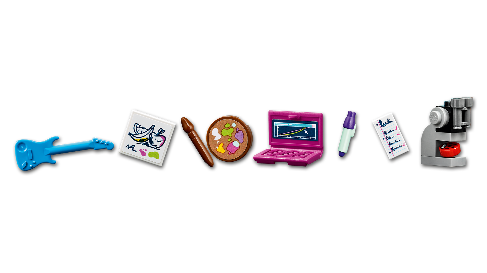 • This LEGO Friends set packs in lots of pretend school toys such as creative drama dress-up props, musical instruments, a ladybug to study under the microscope, plus brushes, paints and an easel.