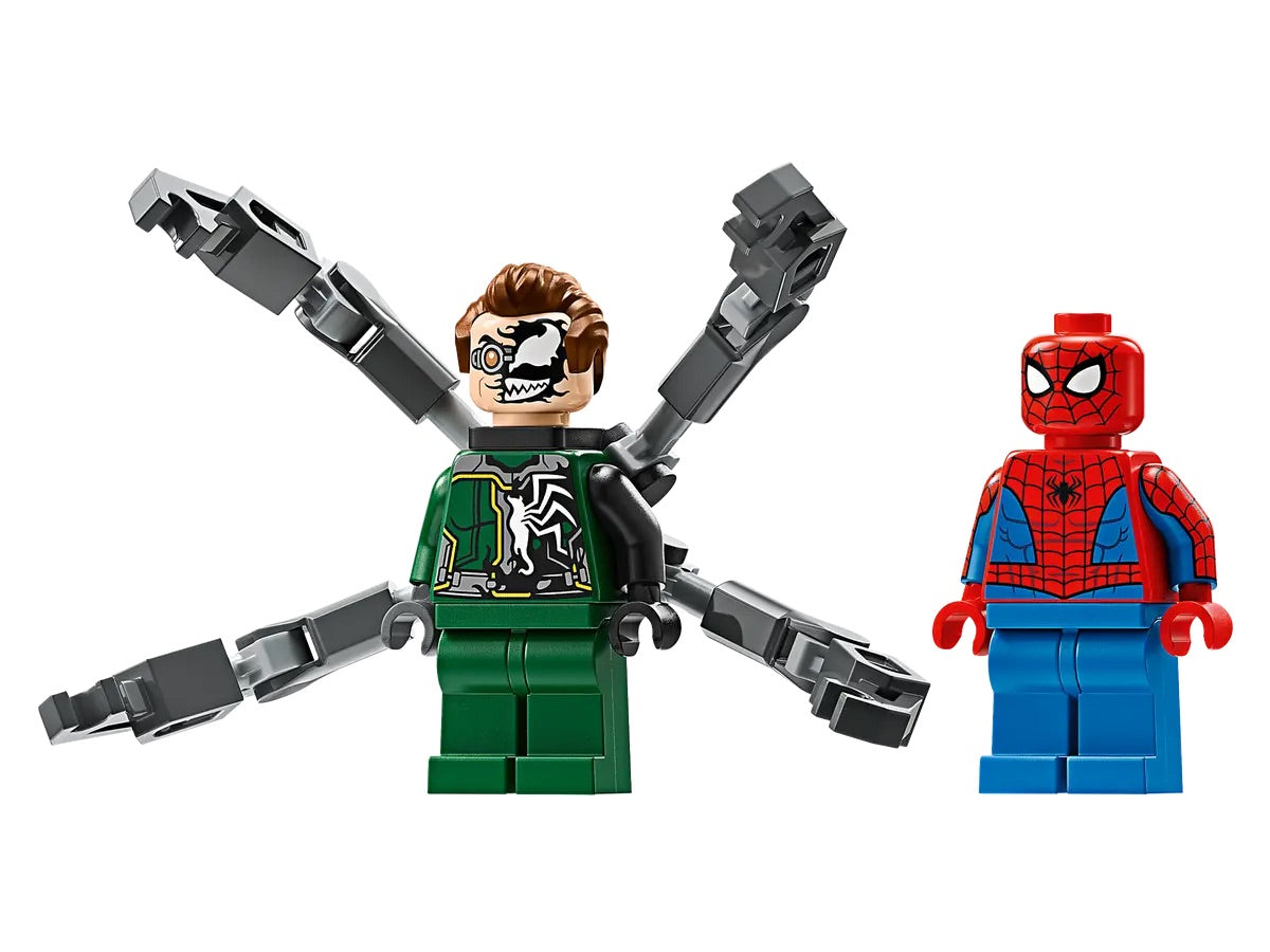 - Spider-Man vs. Doc Ock – Includes a buildable Spider-Man motorcycle with 2 stud shooters, plus 2 minifigures: Spider-Man with 2 web shooters and Doc Ock with 4 long, flexible tentacles