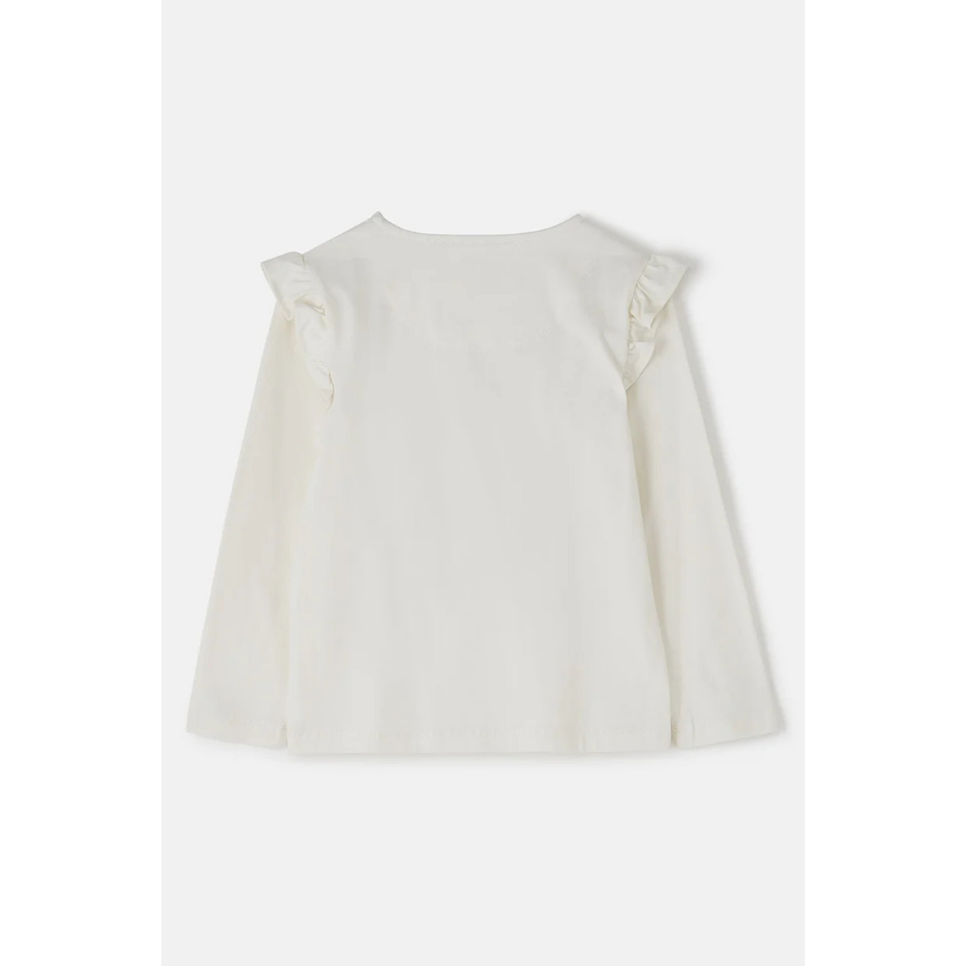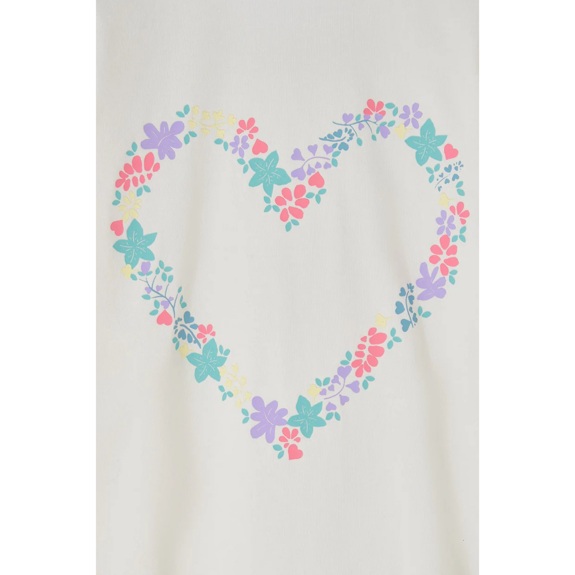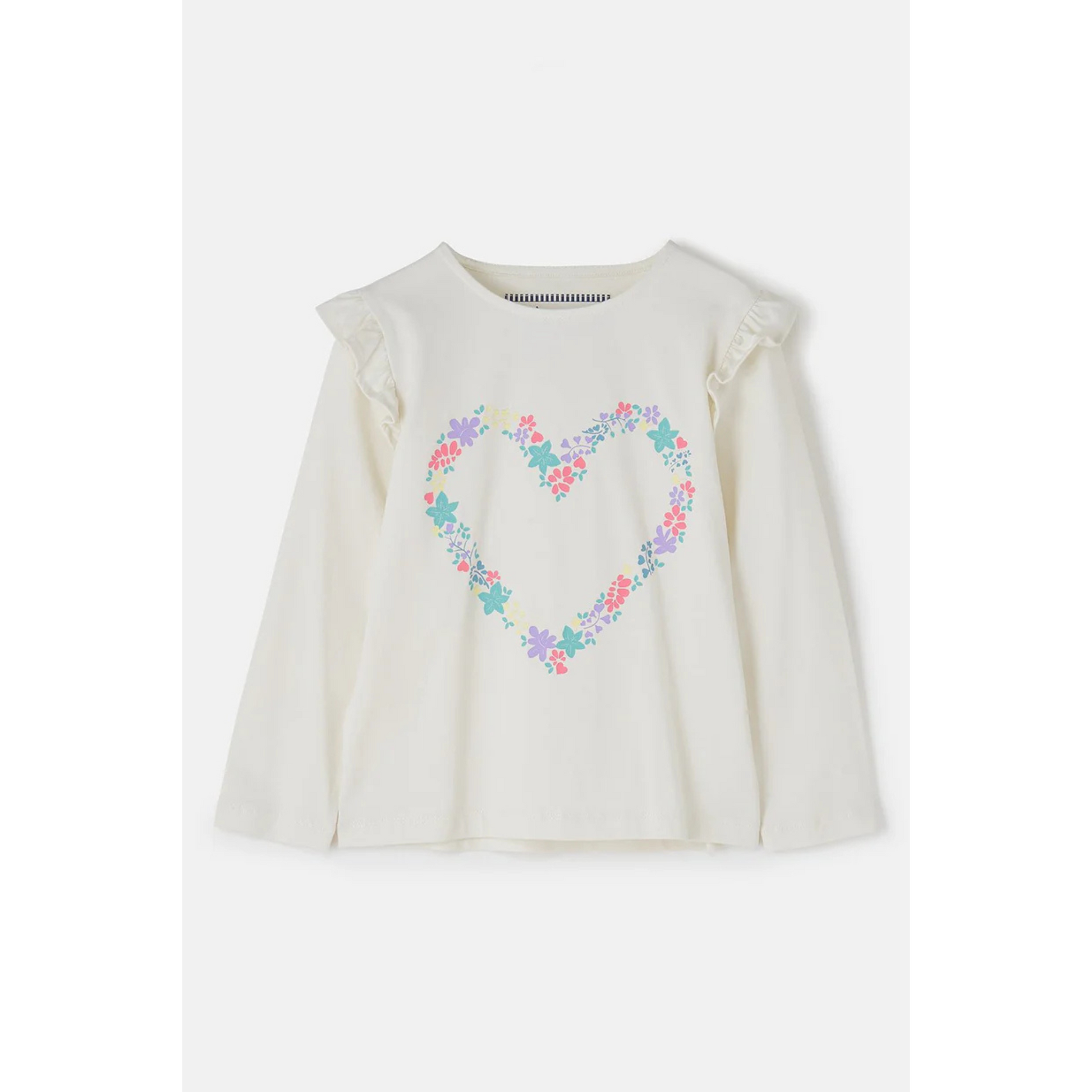This long-sleeved tee is made from a soft cotton-stretch jersey, providing all-day comfort with just the right amount of flexibility for easy movement. The top features a delicate frill detail on the shoulders and a vibrant floral heart print on the front, bringing a pop of colour to cooler days.