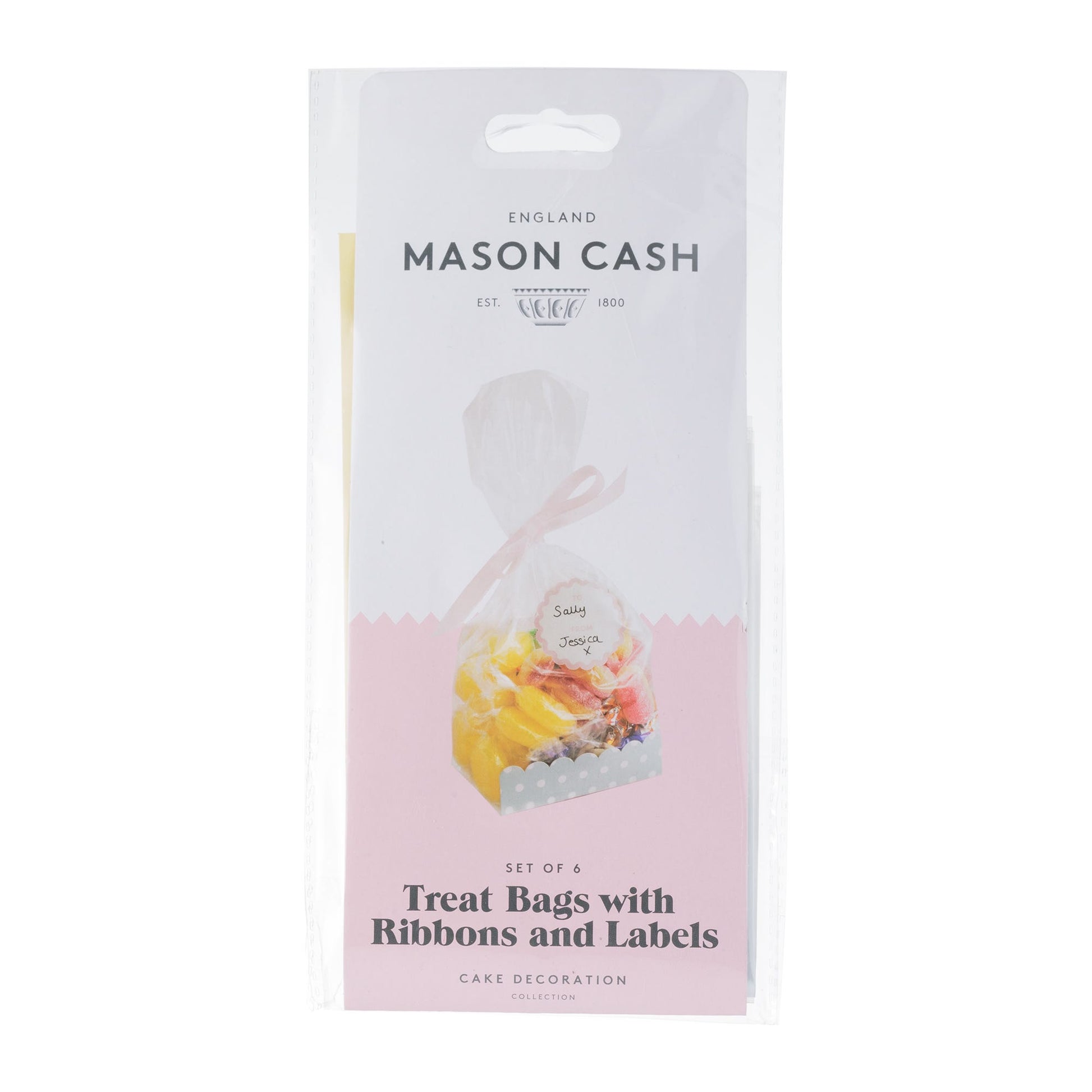 The Mason Cash 6 Polka Dot Treat Bag set includes 6 polybags, 6 card boxes, 6 stickers and 6 ribbons.