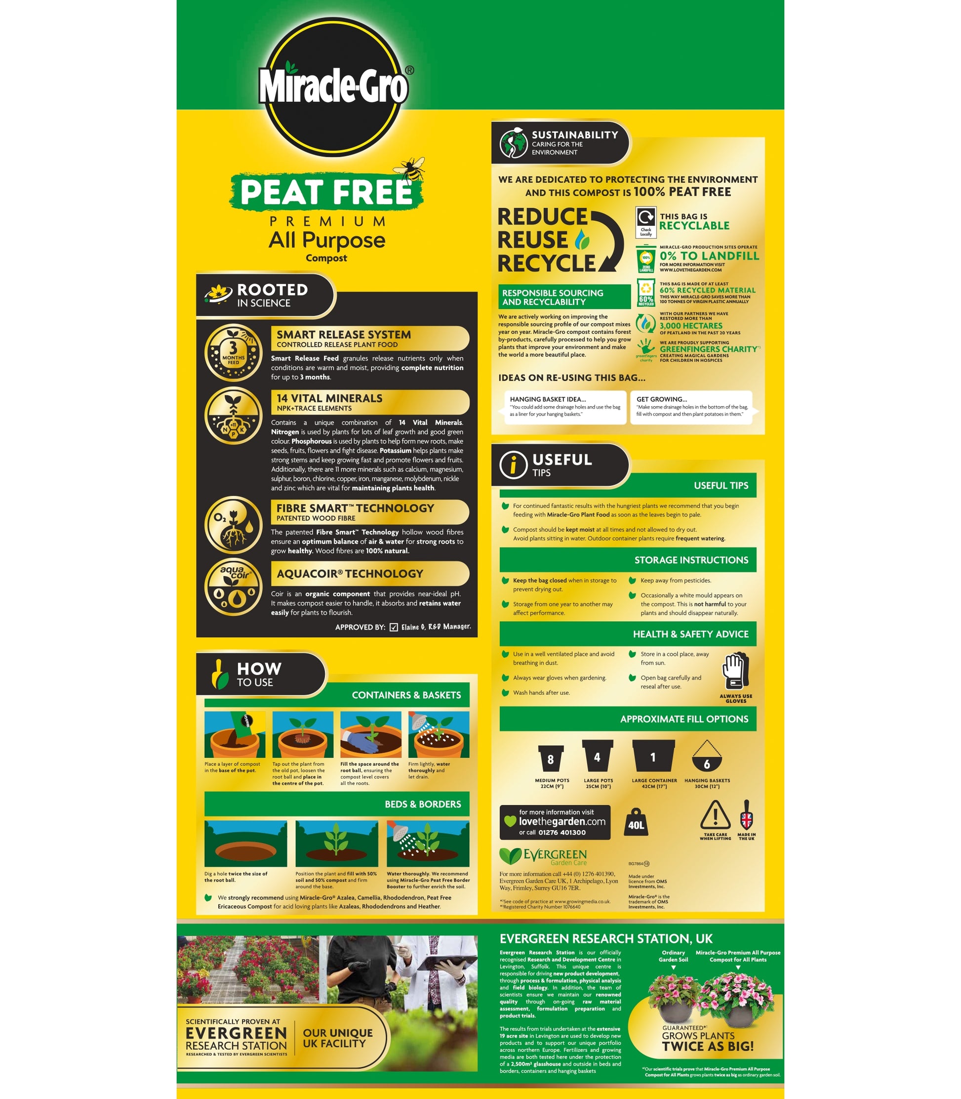 Miracle-Gro Premium Peat Free All-Purpose Compost is ideal for growing fruit and vegetables, with Fibre Smart providing an optimum balance of air and water. It also contains coir - an organic component provides a good PH balance, and uses smart release for feeding for up to 3 months.