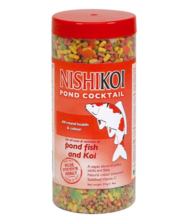 A blend of floating sticks, pellets and flakes for all pond fish.The mix of pellets, sticks and flakes makes Nishikoi Pond Cocktail ideal for feeding a pond containing a range of different pond fish varieties and sizes.Nishikoi Pond Cocktail comprises: Nishikoi Staple (small pellet), Wheatgerm (medium pellet), Pond Sticks, Koi Sticks and Flake.275g