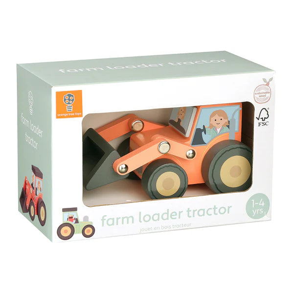 The Orange Tree Toys Farm Loader Tractor is a fun and sturdy wooden toy designed to spark imaginative play.