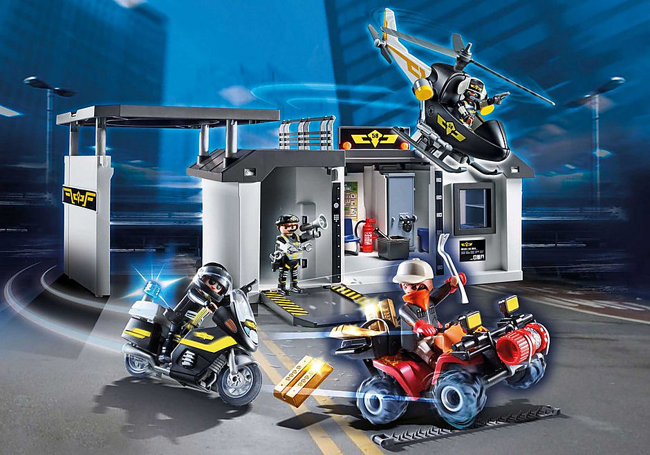 - Accessories: 1 driving SWAT central, 1 SWAT helicopter, 1 SWAT motorcycle, 1 gangster quad, 1 winch, 1 motorcycle helmet, 1 pilot helmet with microphone, 1 police cap with microphone, 1 peaked cap, 1 shield, 3 pairs of arm cuffs, 1 gun cabinet, 1 shelf, 1 folding table, 2 chairs, 1 alarm bell, 3 gold bars, 1 megaphone, 2 handcuffs, 4 flashlights, 1 fire extinguisher, 2 batons, 2 door rammers, 3 pistols, 4 rifles large, 2 rifles small, 1 nail band, 1 crowbar, 1 camera, 3 index cards, 1 neckerchief, 1 pair of crook gloves, 1 tub, 1 storage box, 2 connectors dark grey, 2 connectors light grey.