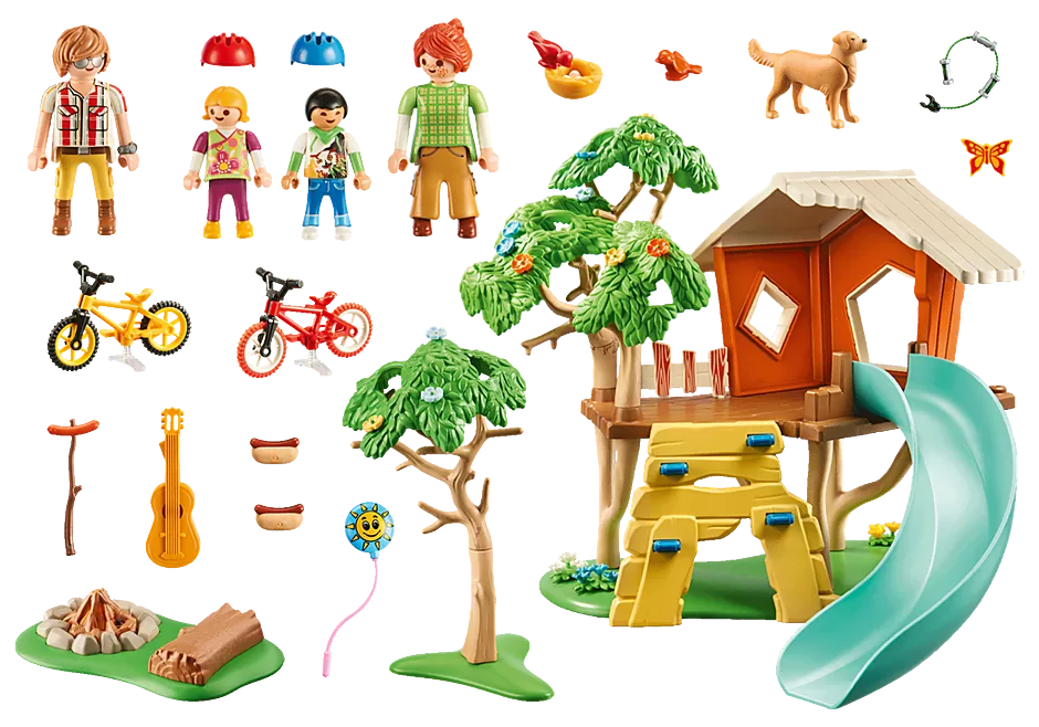- Accessories: 1 tree house, 1 tree, 1 guitar, 1 stick with sausages, 1 campfire, 1 wrist watch, 1 balloon, 1 hot dog, 2 bicycles, 2 bicycle helmets.