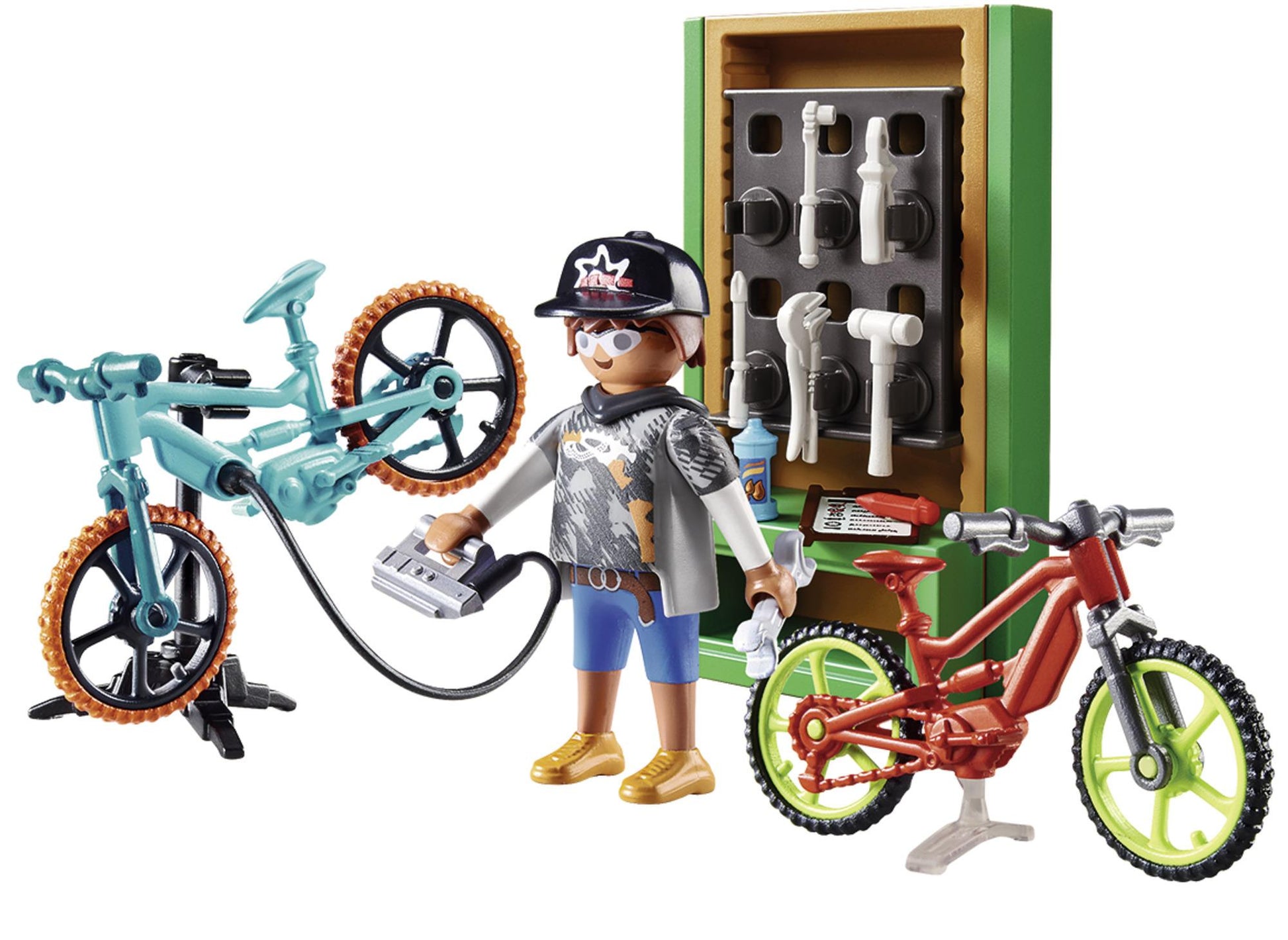 Includes 2 Playmobil bikes, 1 mechanic figure, a workshop bench and many related accessories.