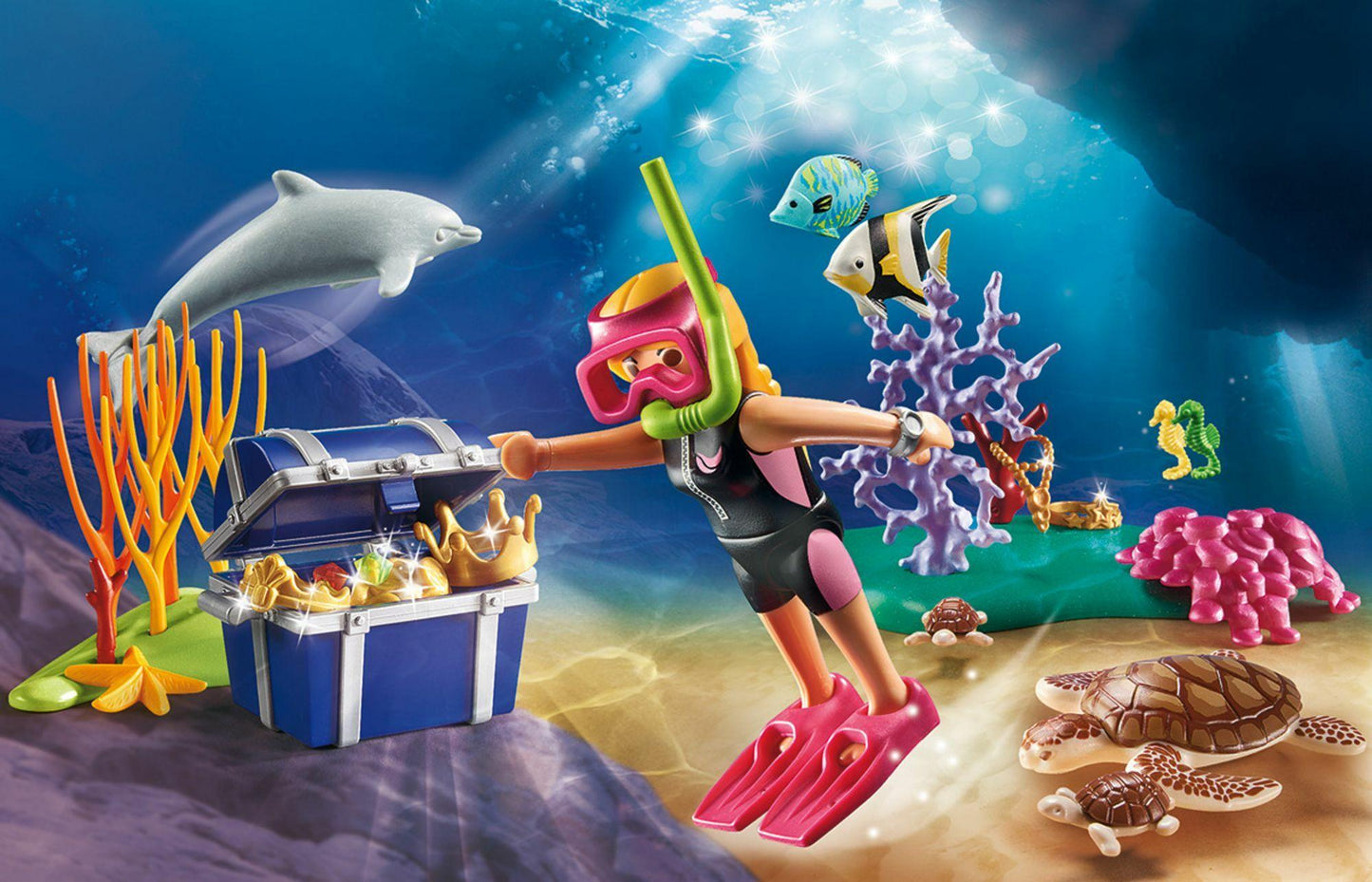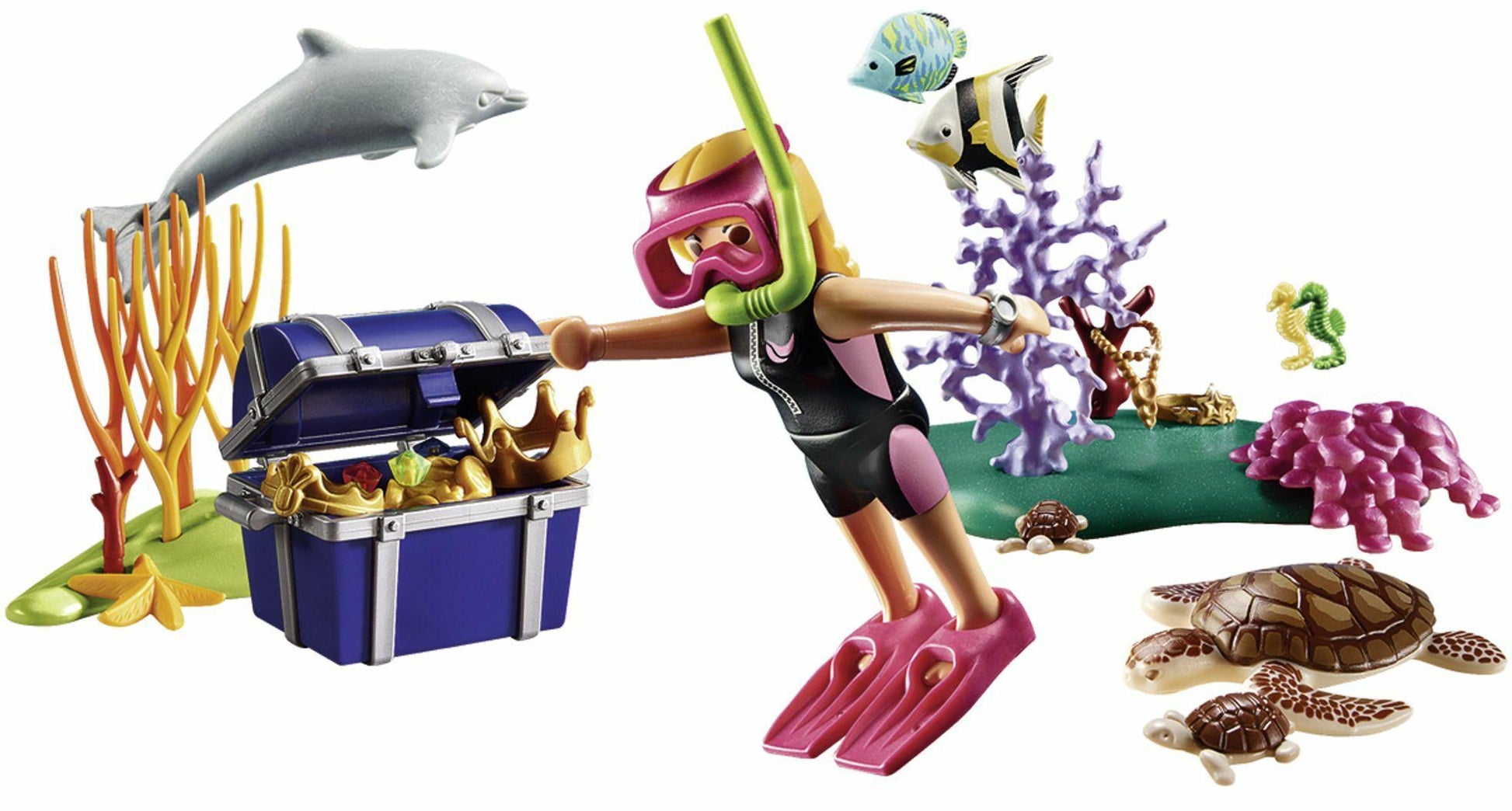 - Includes 1 diver, a treasure chest, many sea life animals and many aquatic accessories.