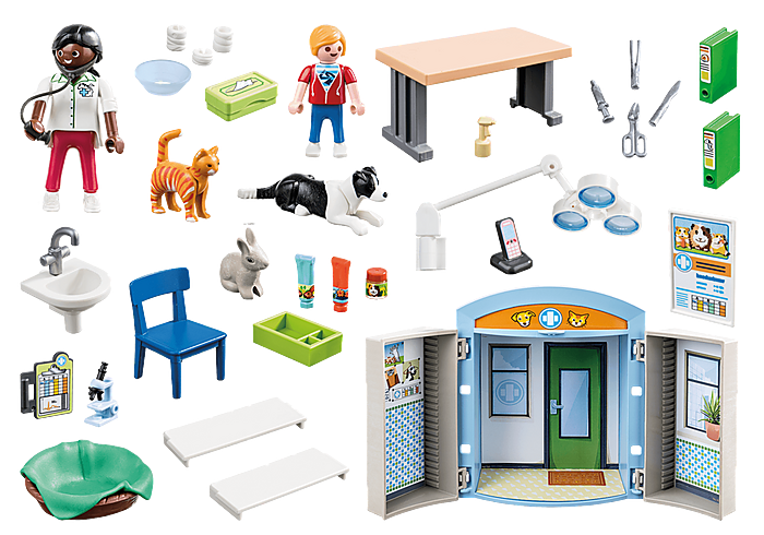 - Accessories: 1 microscope, 2 folders, 3 food cans, 1 clipboard, 1 sink, 1 shelf, 1 operating light, 1 cat basket, 3 bandages, 1 neck brace, 1 poster, 1 stethoscope, 1 lunch box, 1 box, 1 telephone, 1 treatment table, 1 chair.