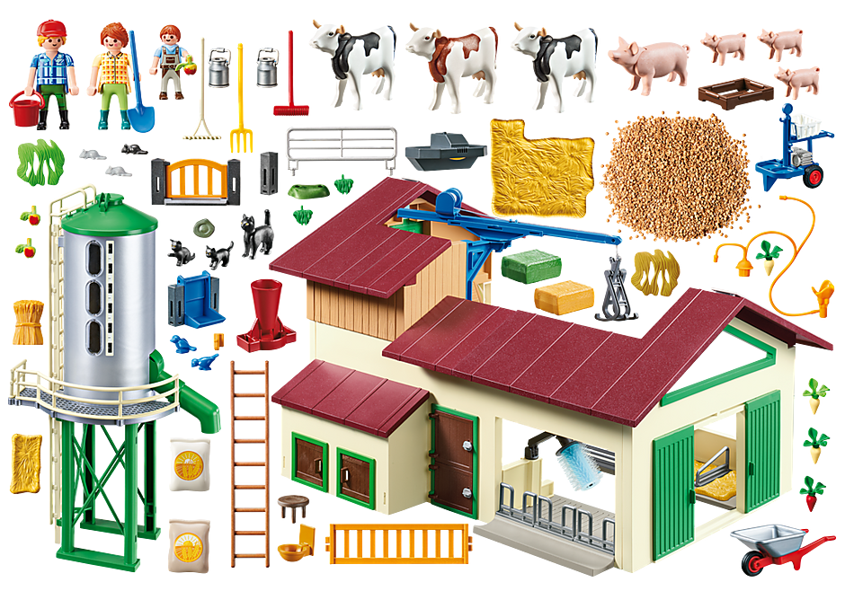 - Accessories: 1 farm, 1 silo, 1 bulk material, 3 bales of straw, 1 bale of hay, 2 straw beds, 2 straw sacks, 3 apples, 4 carrots, 1 wooden staircase, 2 green fodder, 2 straw fodder, 1 stool, 1 drinking trough, 1 heat lamp, 1-grain yarrow, 3 fence elements, 1 fence gate, 2 fence connectors, 6 gates, 6 gate feet, 1 ladder, 1 feeding trough, 1 automatic feeder, 1 milking machine, 1 milk hose, 2 milk cans, 1 wheelbarrow, 1 broom, 1 rake, 1 pitchfork, 1 shovel, 1 bucket, 1 cap, 2 tendrils, 1 hook.