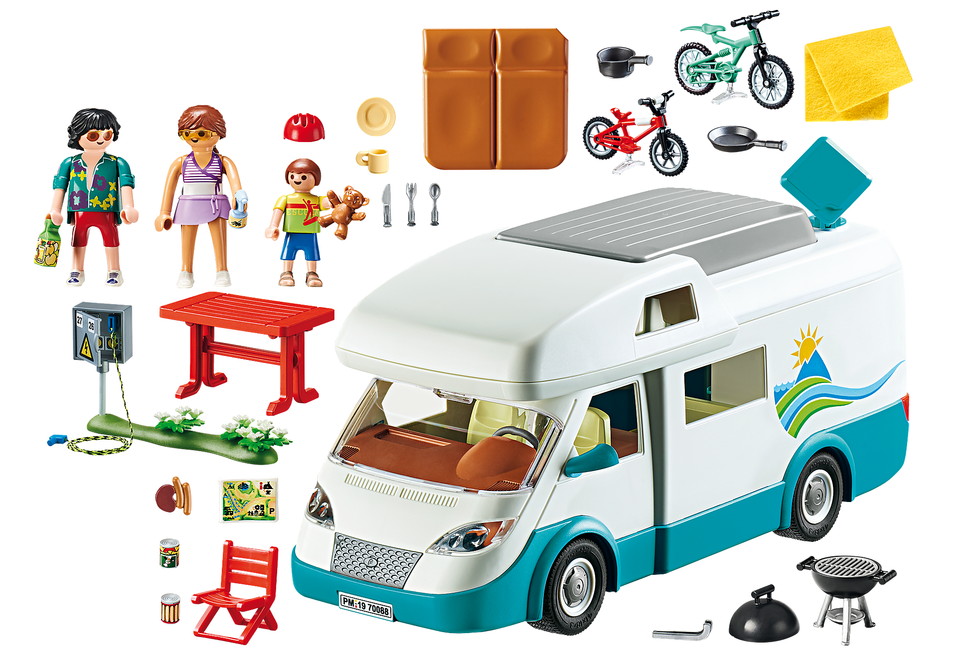 - Accessories: 1 mobile home, 1 green strip with electric box and flowers, 4 spoons, 4 knives, 4 forks, 4 plates, 4 cups, 1 map, 2 tins, 1 juice bag, 1 camping table, 4 camping chairs, 1 pan, 1 pot, 1 double mattress, 1 mountain bike large, 1 mountain bike small, 1 teddy bear, 1 bicycle helmet, 1 ball grill with lid, 1 grill tongs, 1 grill meat, 1 towel, 1 sun cream.