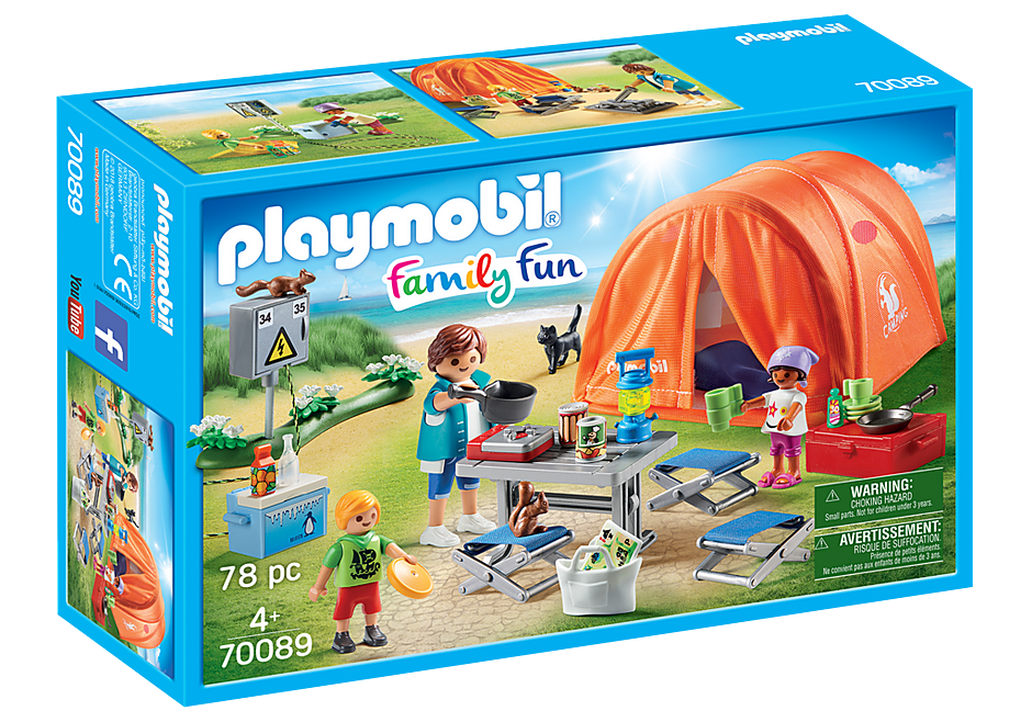 Accessories: 1 tent, 1 green area with flowers and electric box, 2 sleeping bags, 1 camping table, 3 camping stools, 1 bottle, 1 gas lamp, 1 tube, 1 gas cooker, 1 map, 1 pan, 1 pot, 2 tins, 1 juice bag, 3 plates, 3 cups, 1 frisbee, 1 cool box, 1 box, 1 bandana.
