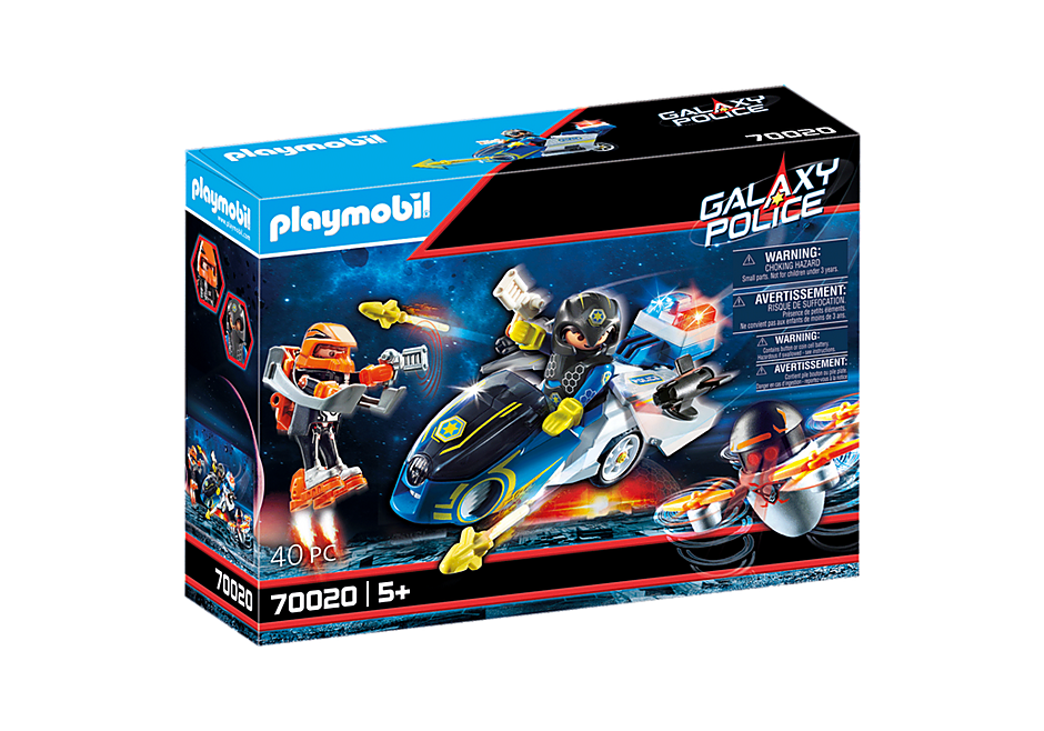 Playmobil Galaxy Police Bike with working flashing light (batteries included), fold-out wings and snippets.
